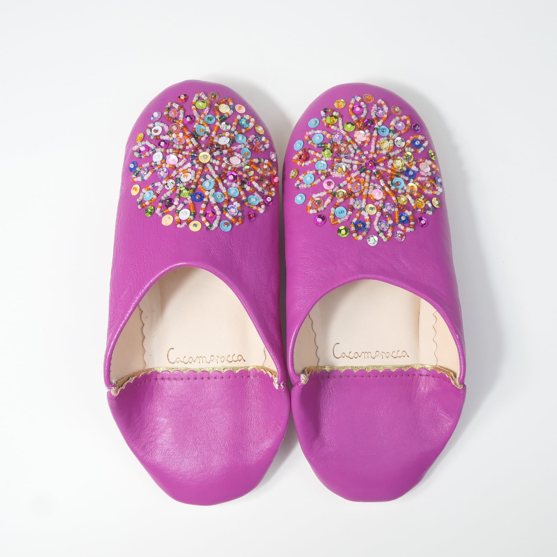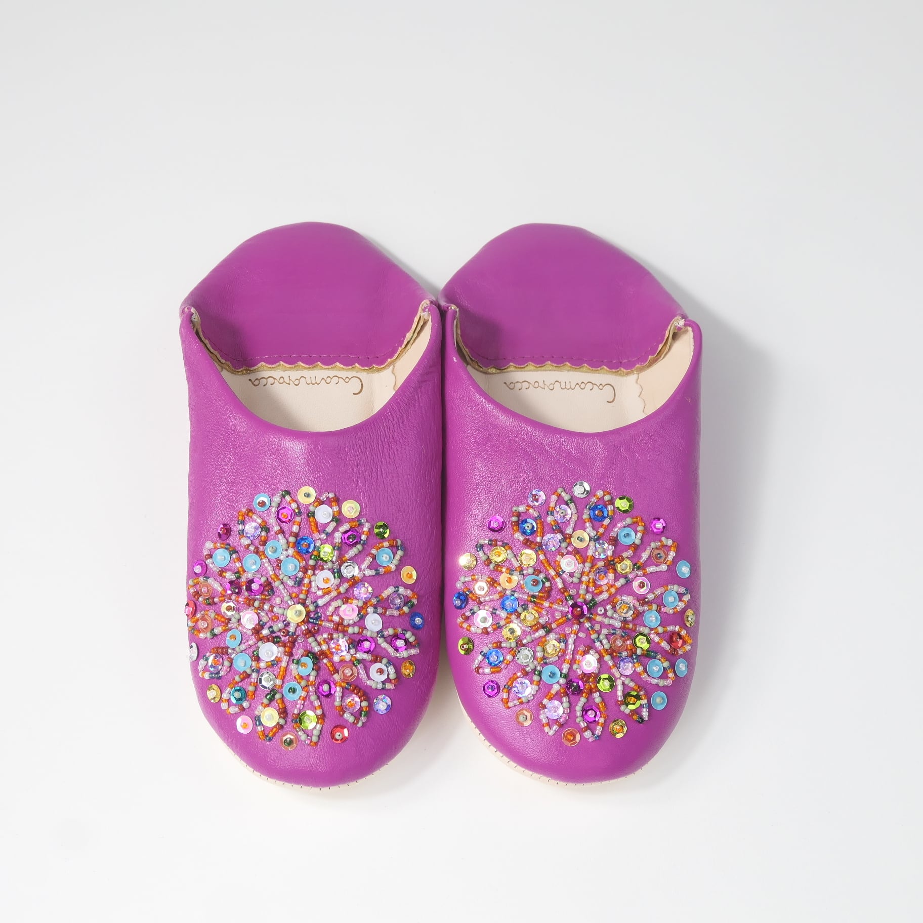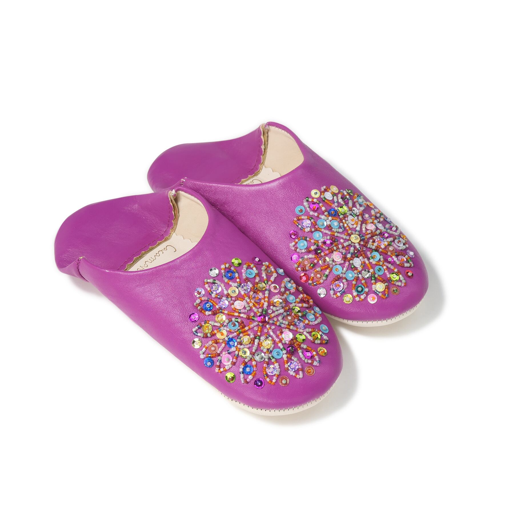 受注生産 マゼンタ(ミックス スパンコール)レザー バブーシュ スリッパ