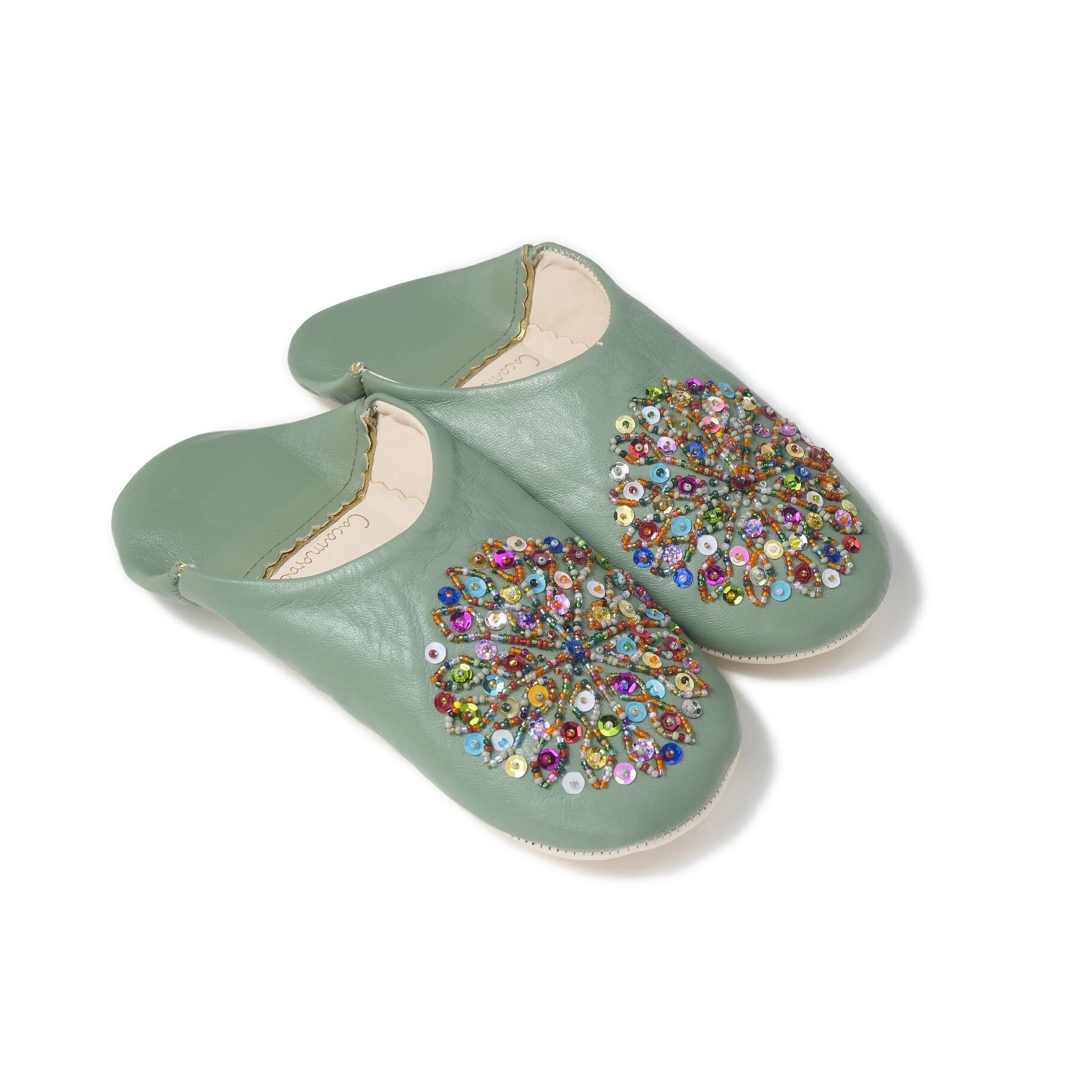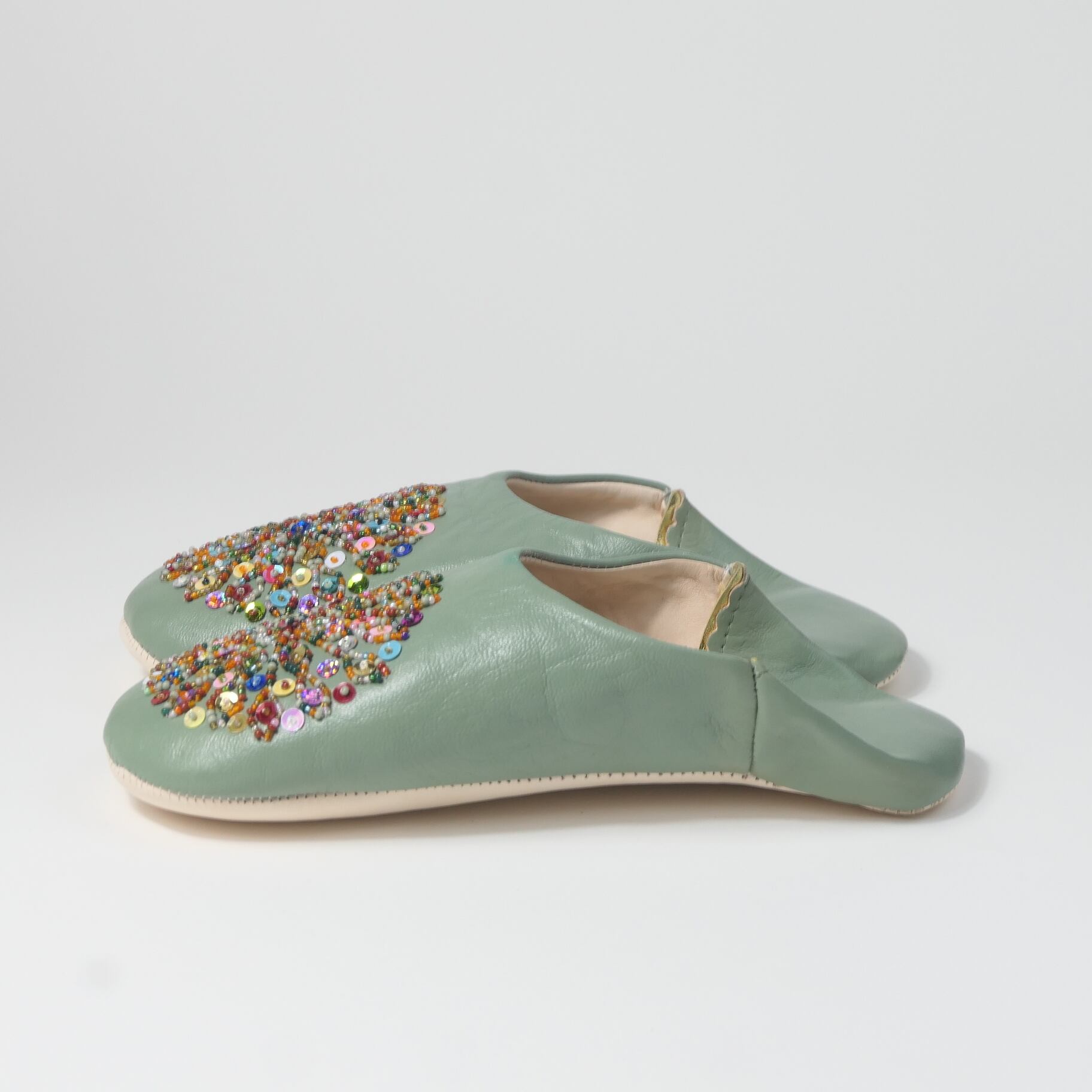 受注生産 オリーブ(ミックス スパンコール)レザー バブーシュ スリッパ