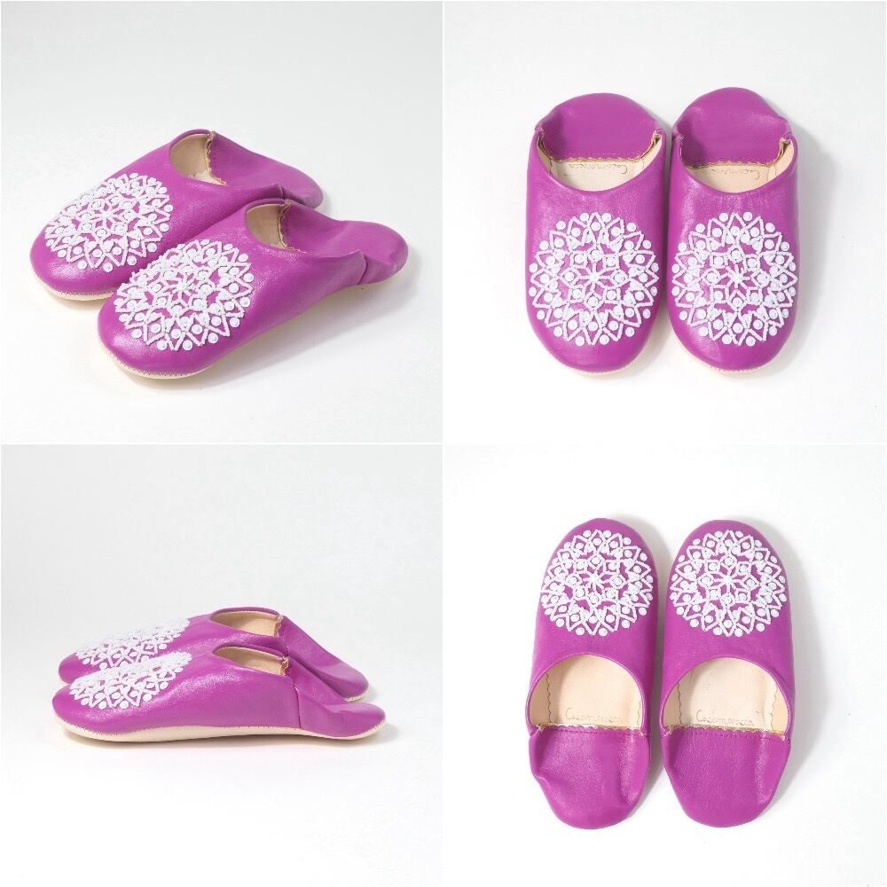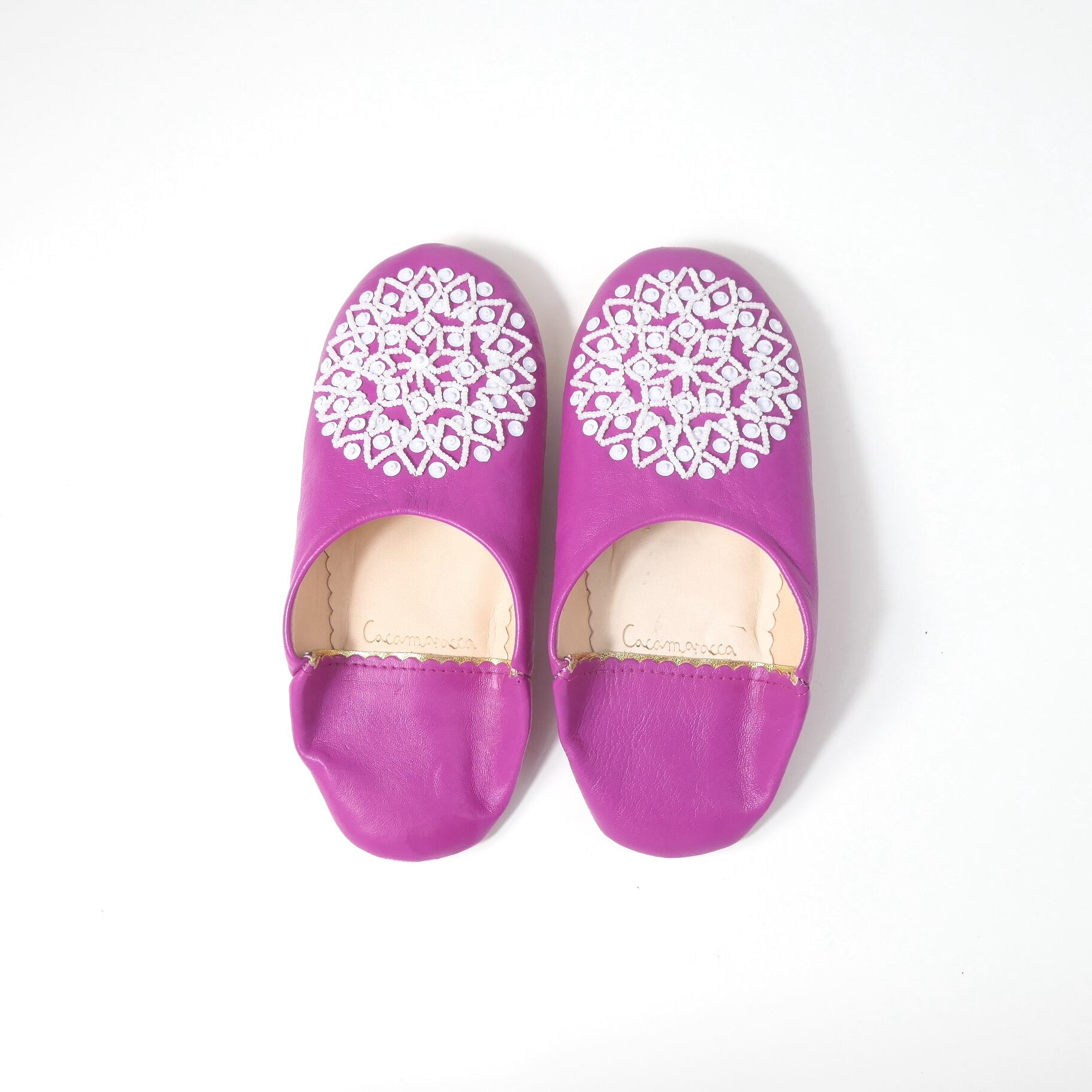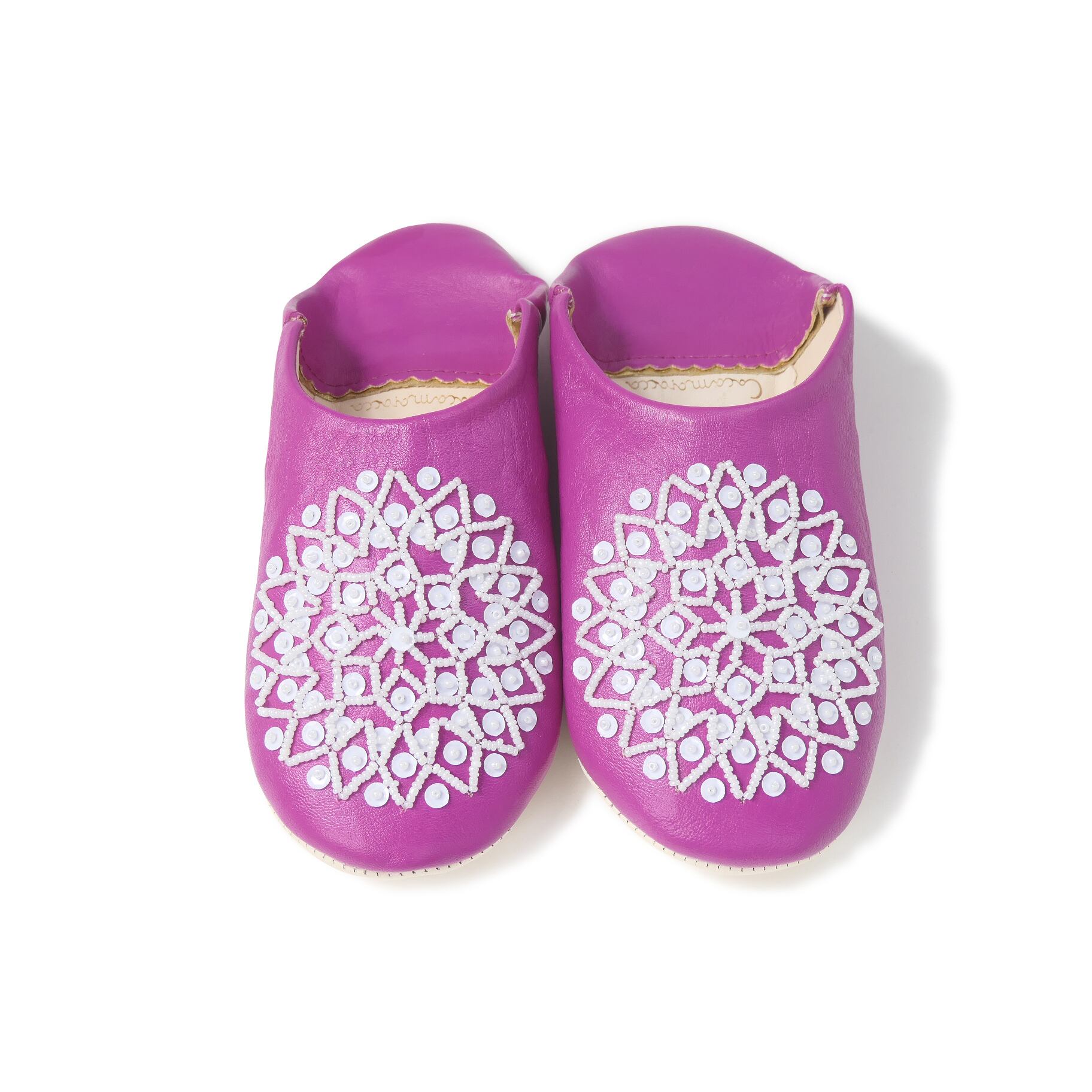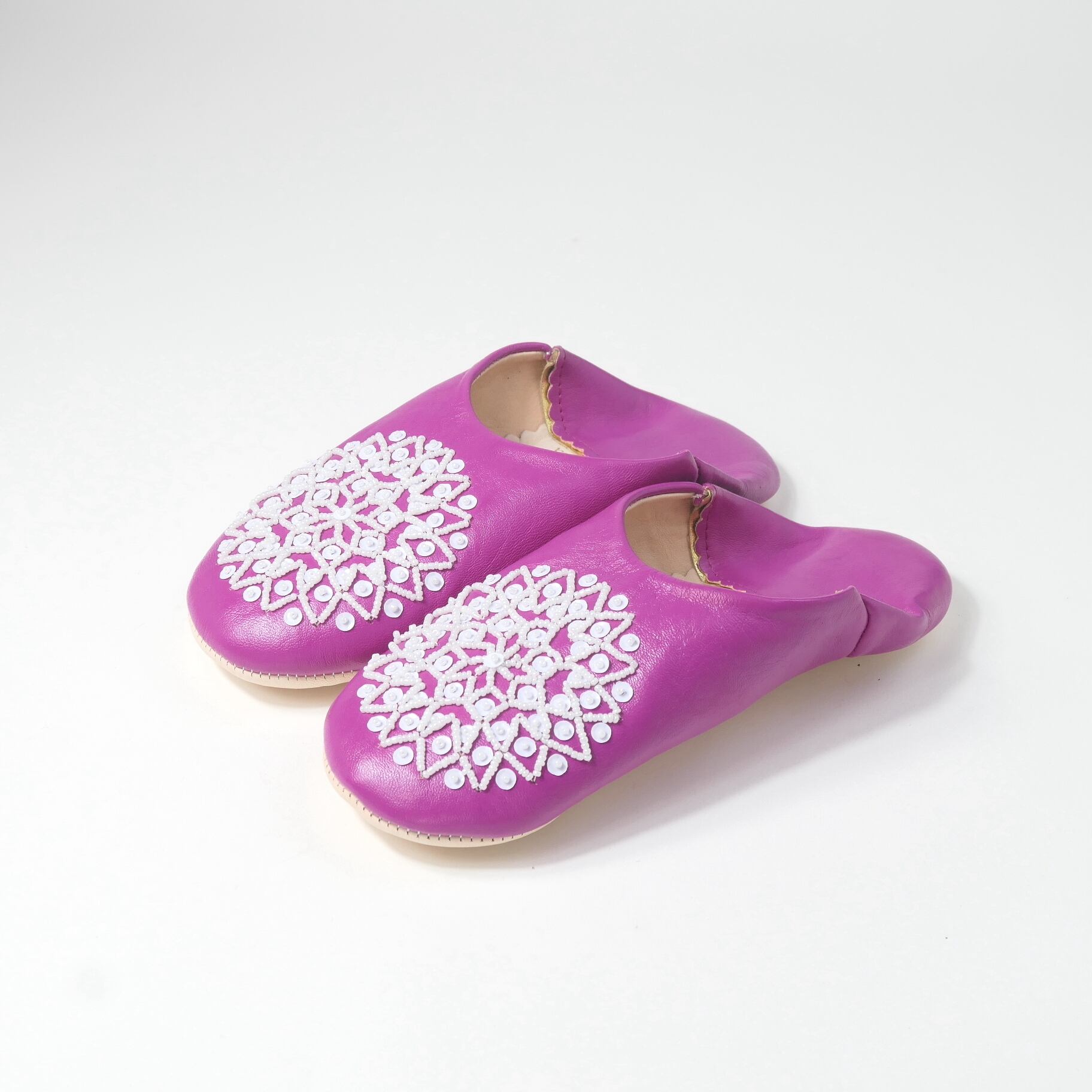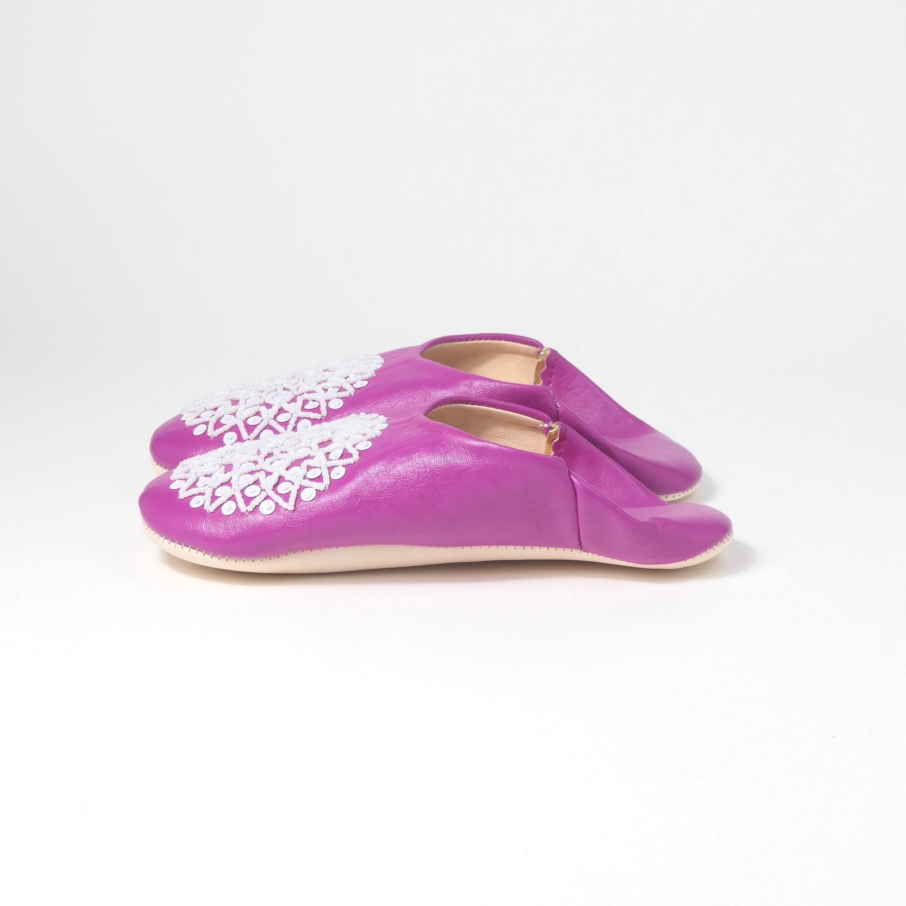 受注生産 マゼンタ(ホワイト スパンコール) レザー バブーシュ スリッパ