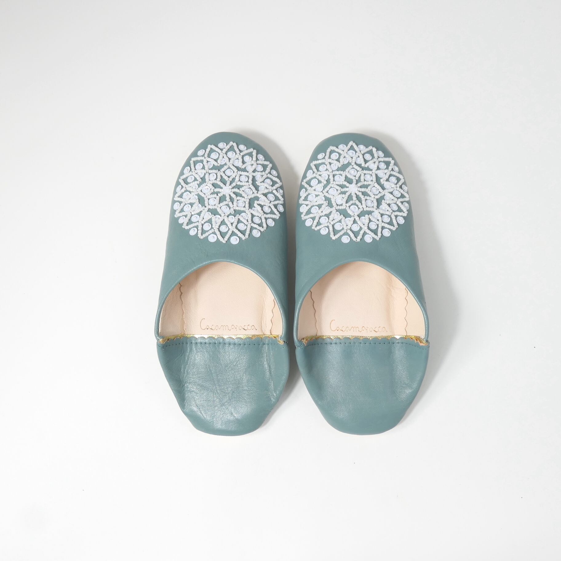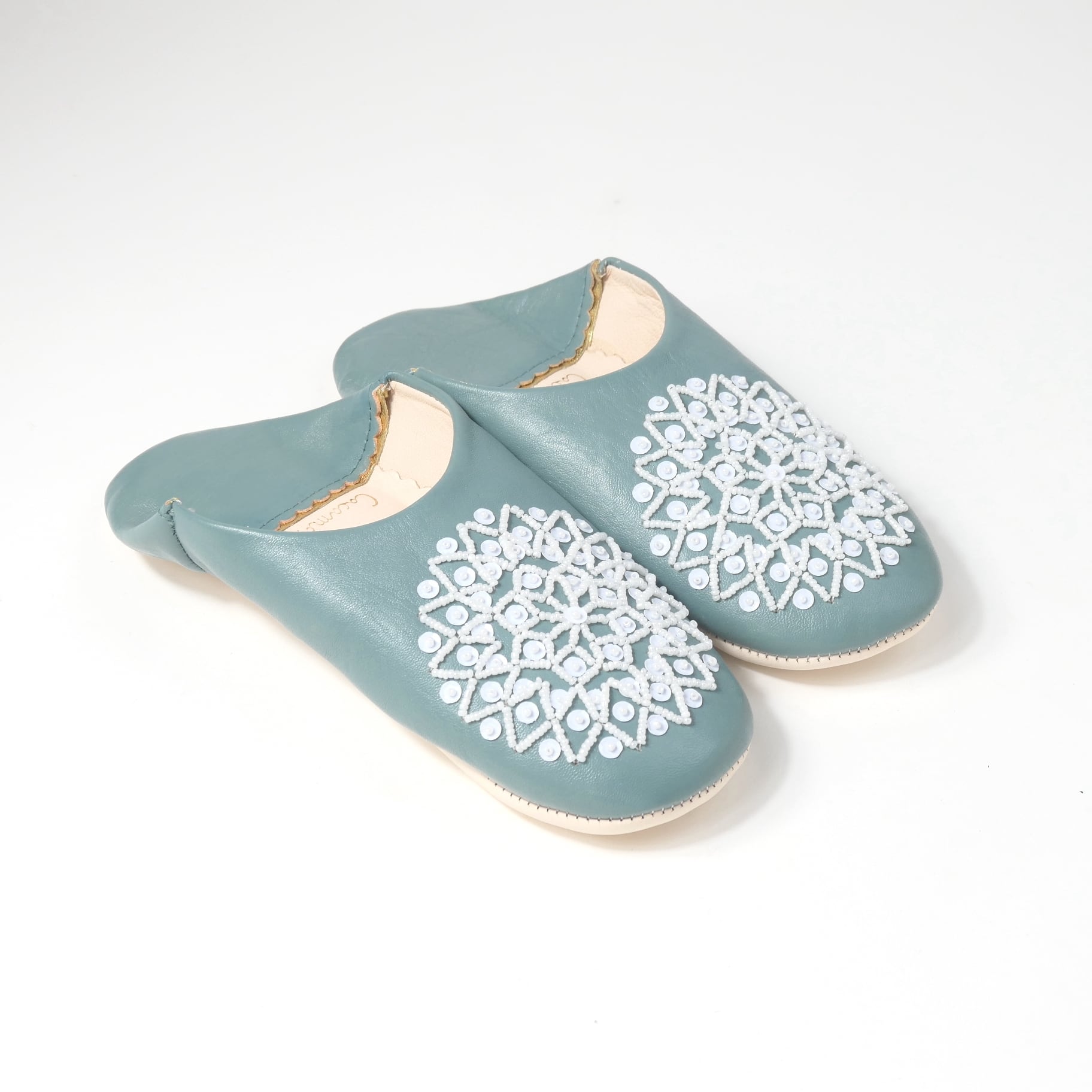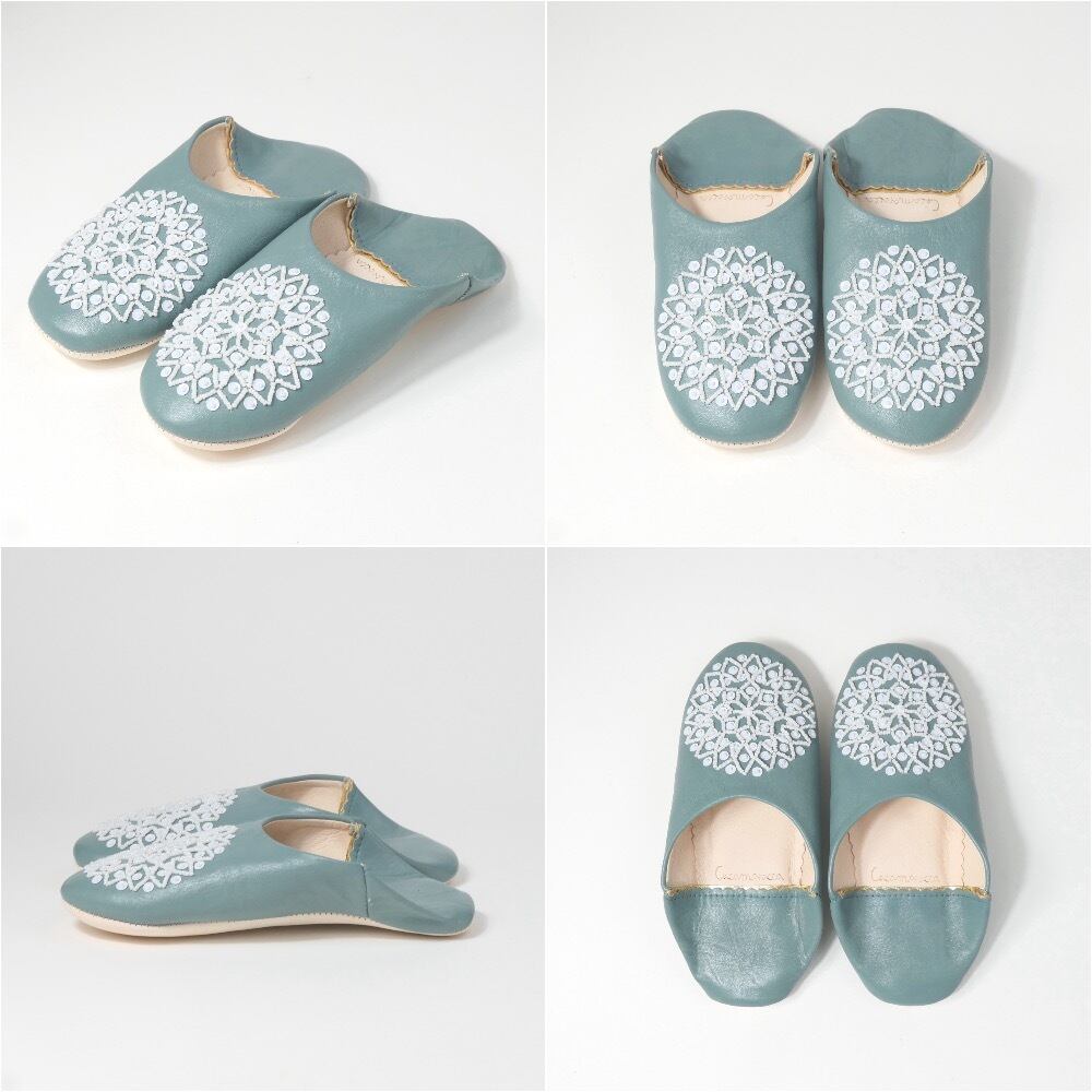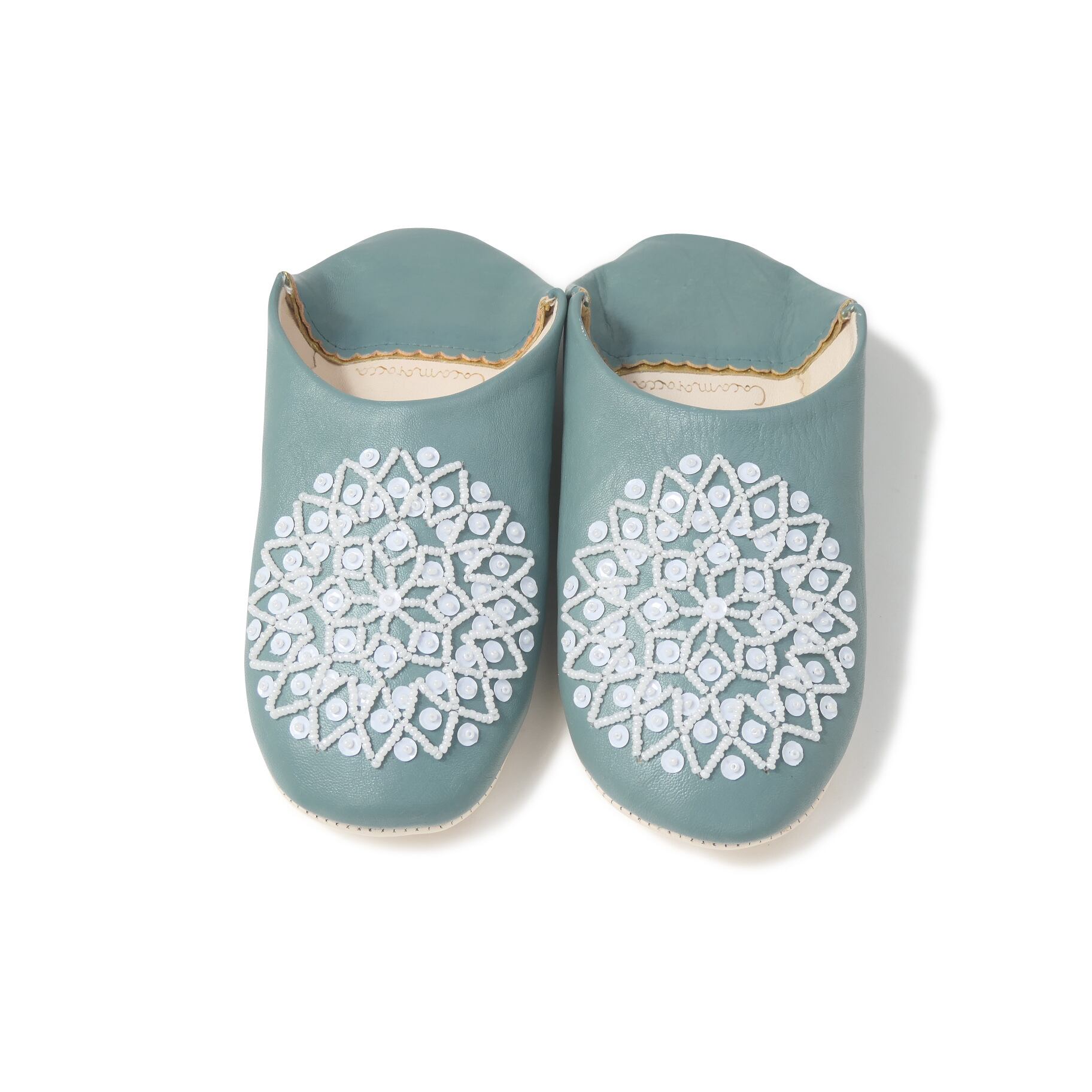 受注生産 アクアグリーン(ホワイト スパンコール) レザー バブーシュ スリッパ