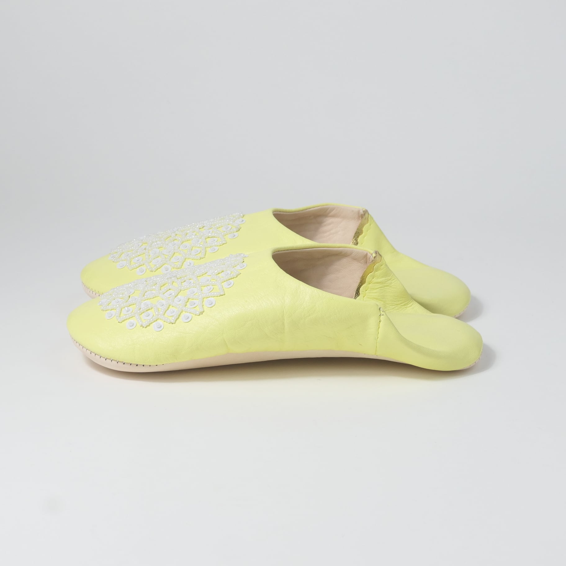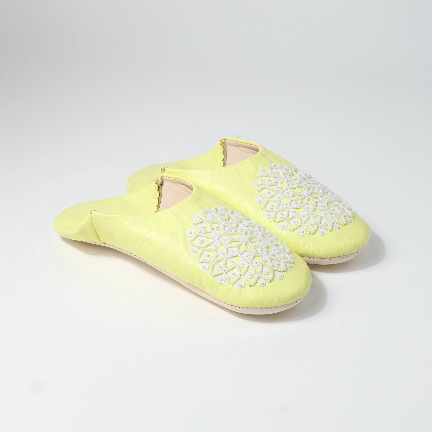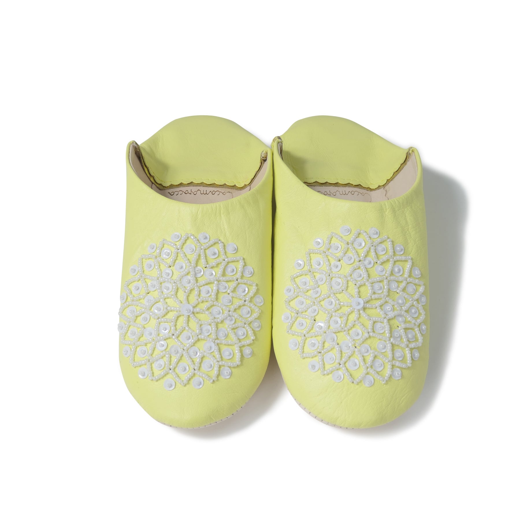 受注生産 ソフトイエロー(ホワイト スパンコール) レザー バブーシュ スリッパ