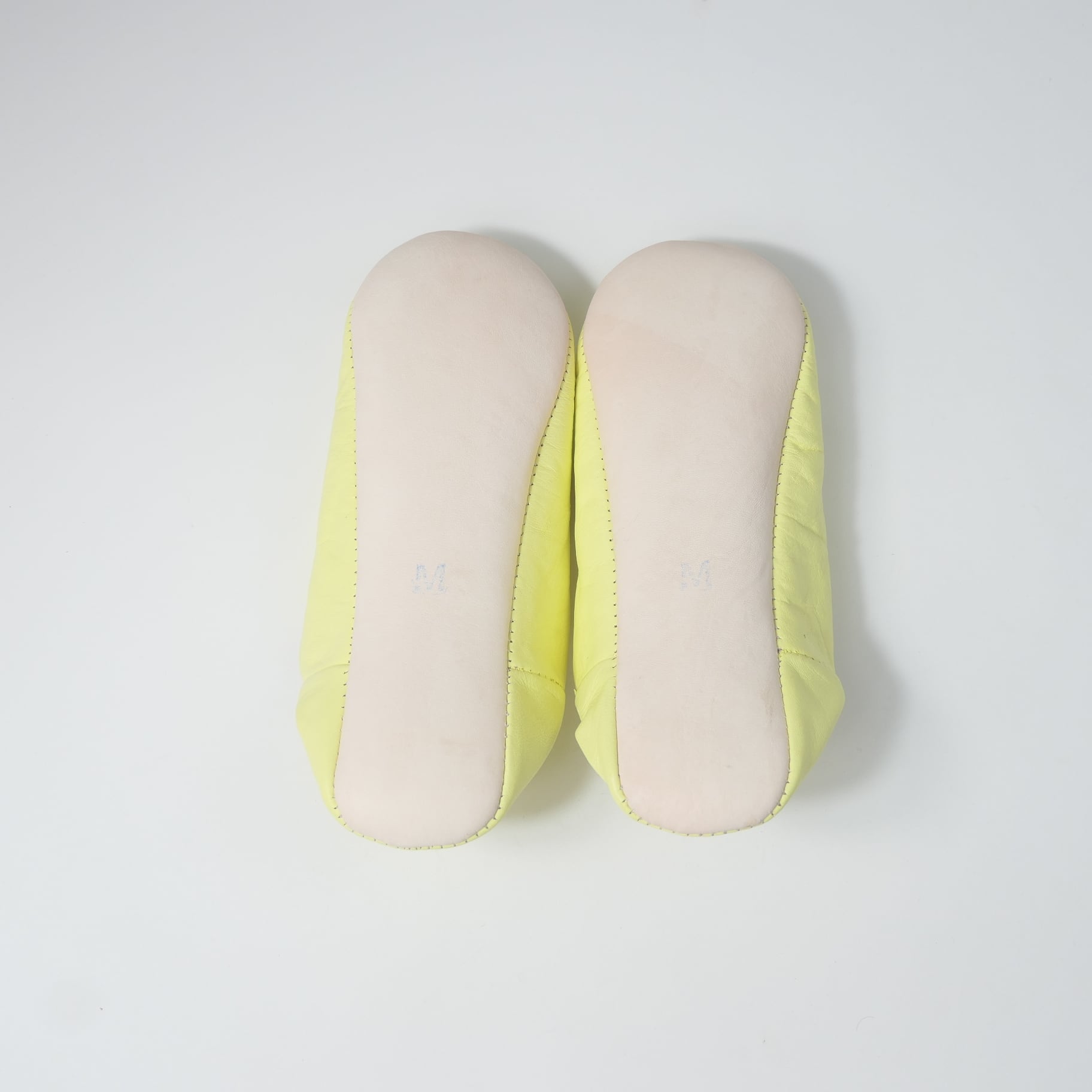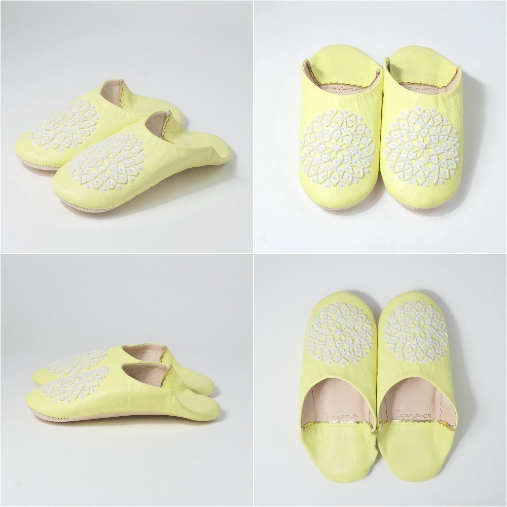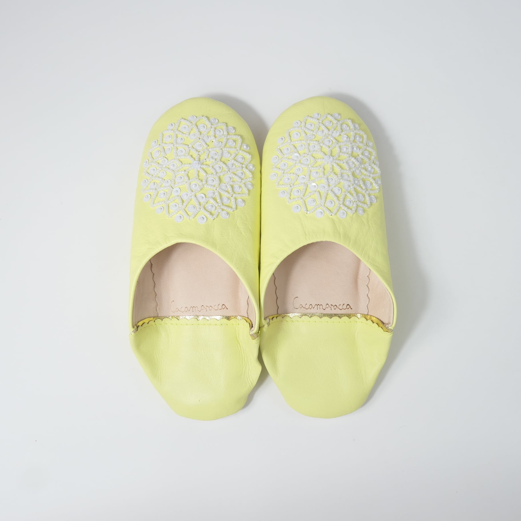 受注生産 ソフトイエロー(ホワイト スパンコール) レザー バブーシュ スリッパ