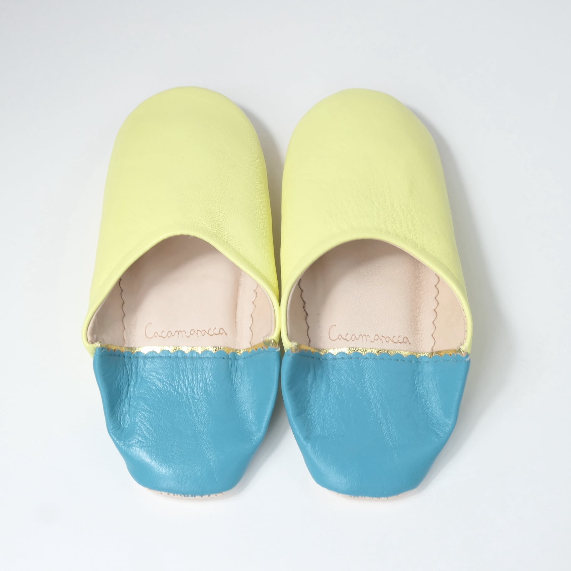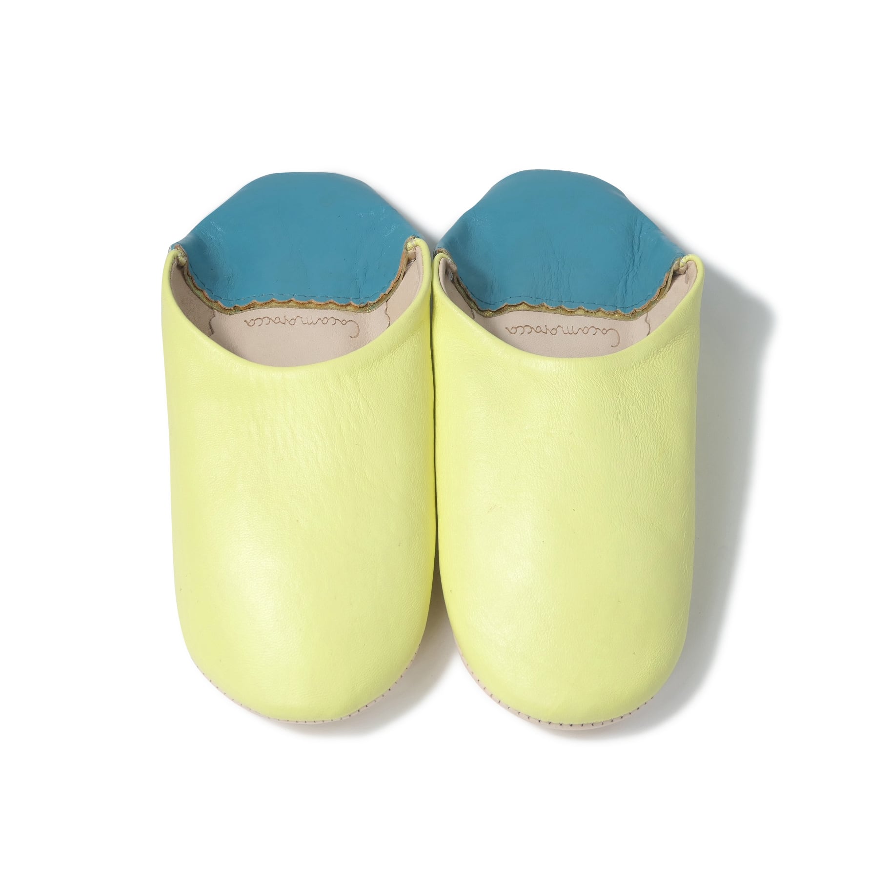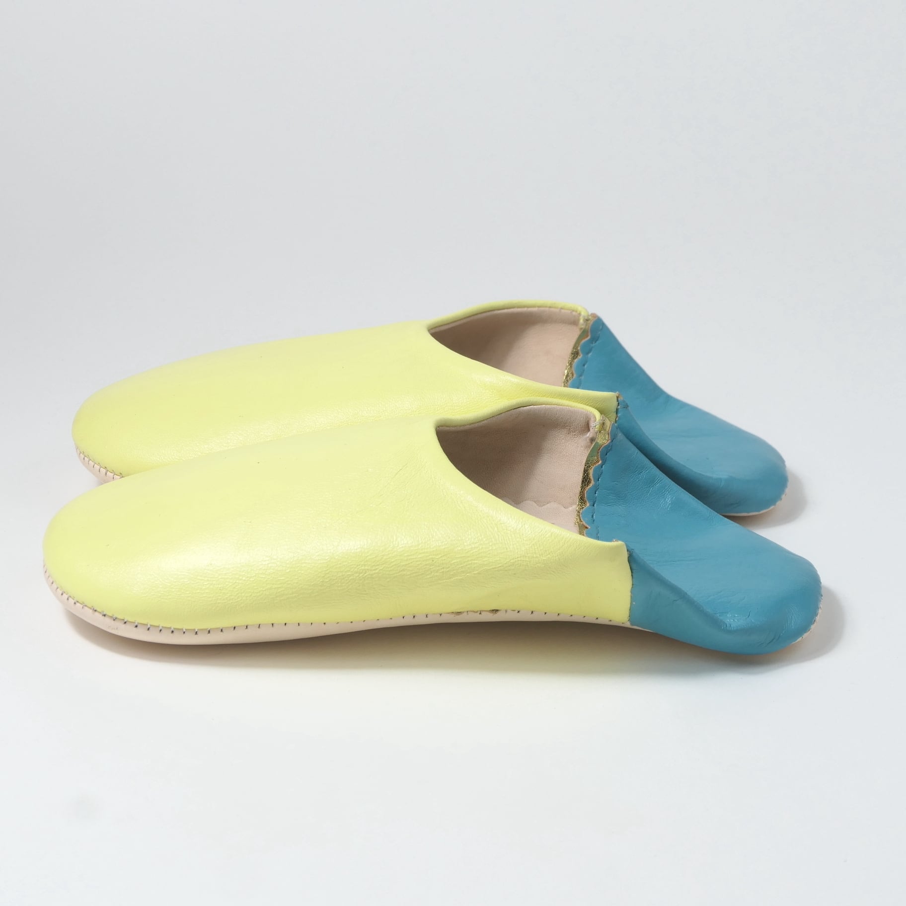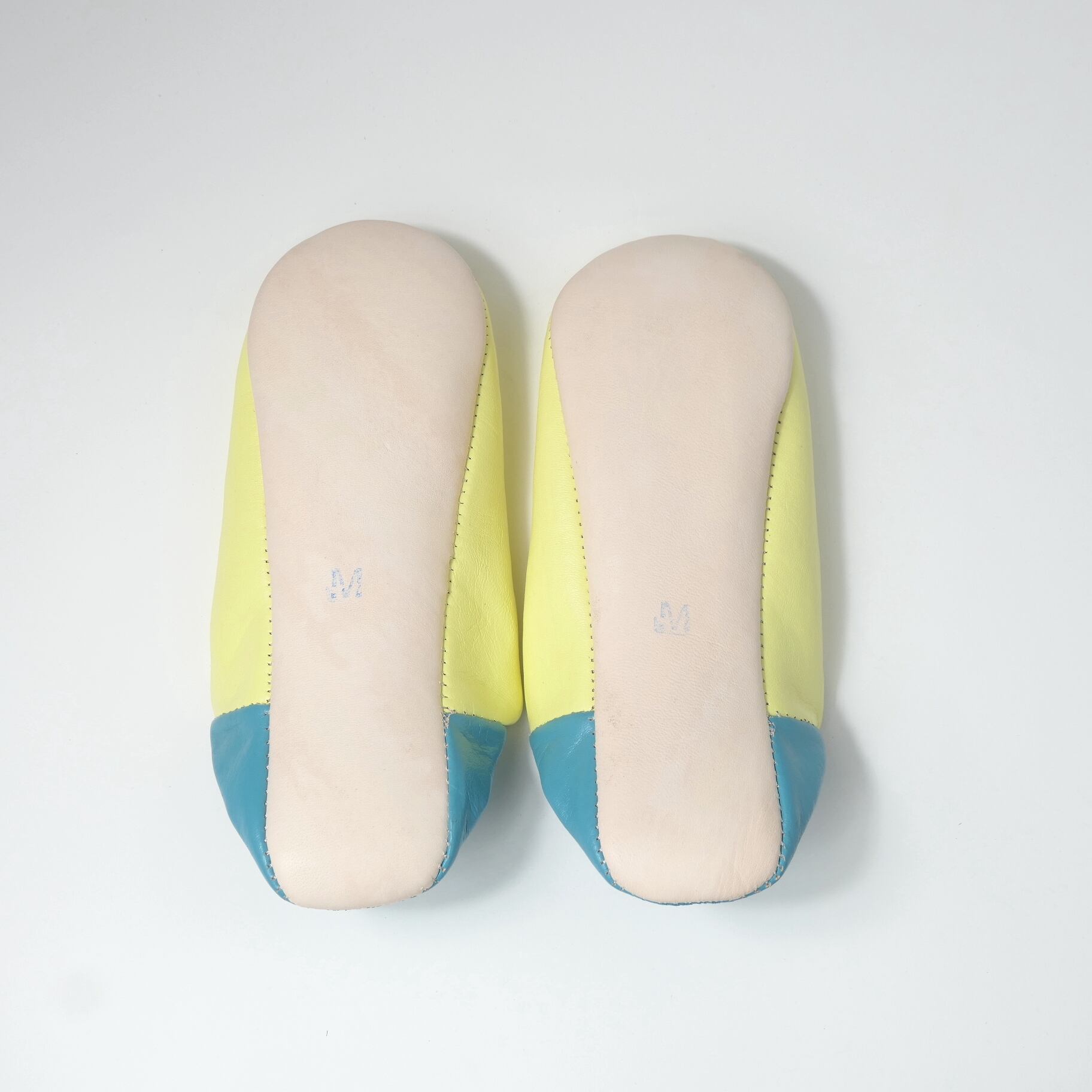 受注生産 ソフトイエロー×ブルー(プレーン)レザー バブーシュ スリッパ