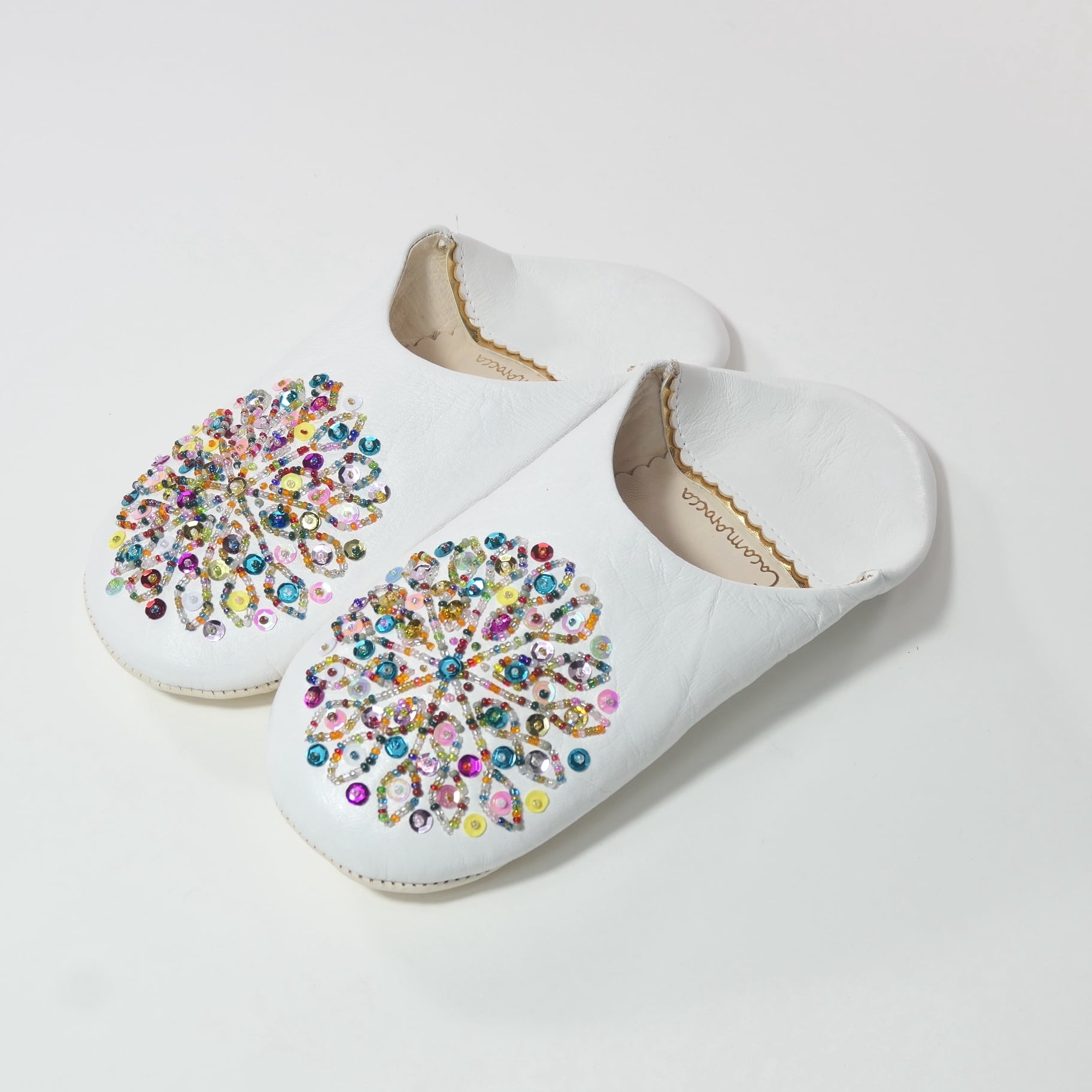 ホワイト(ミックス スパンコール)レザー バブーシュ スリッパ