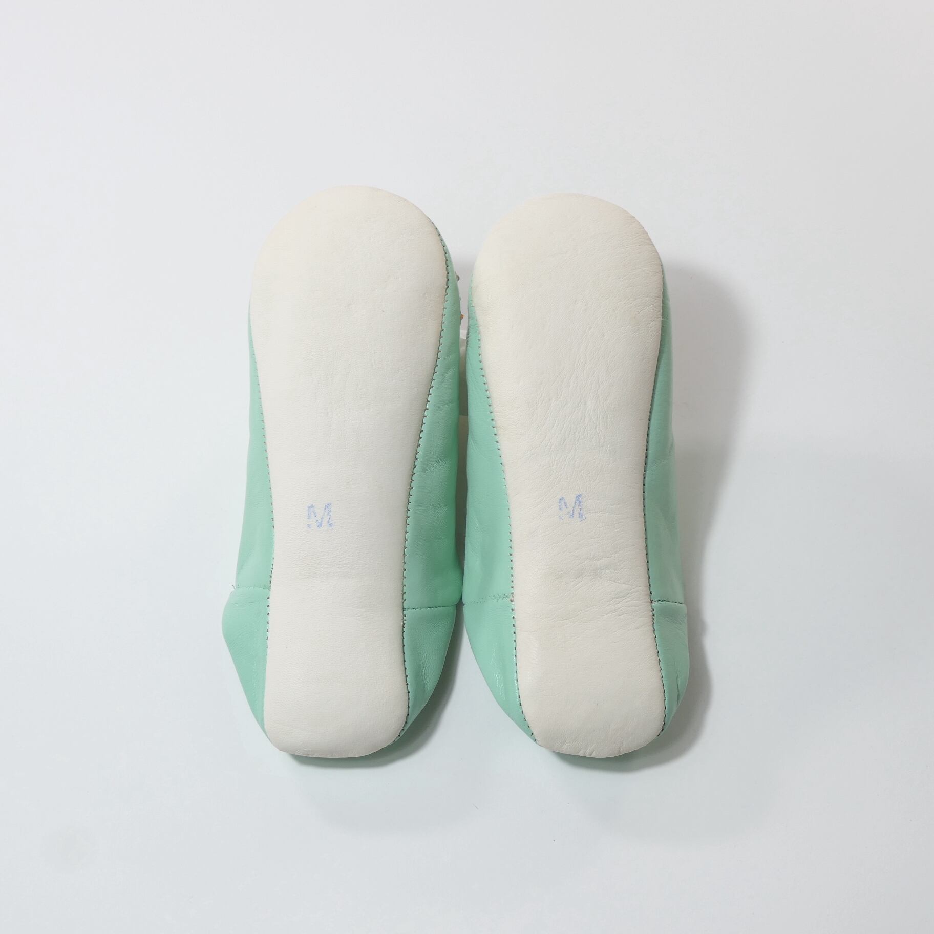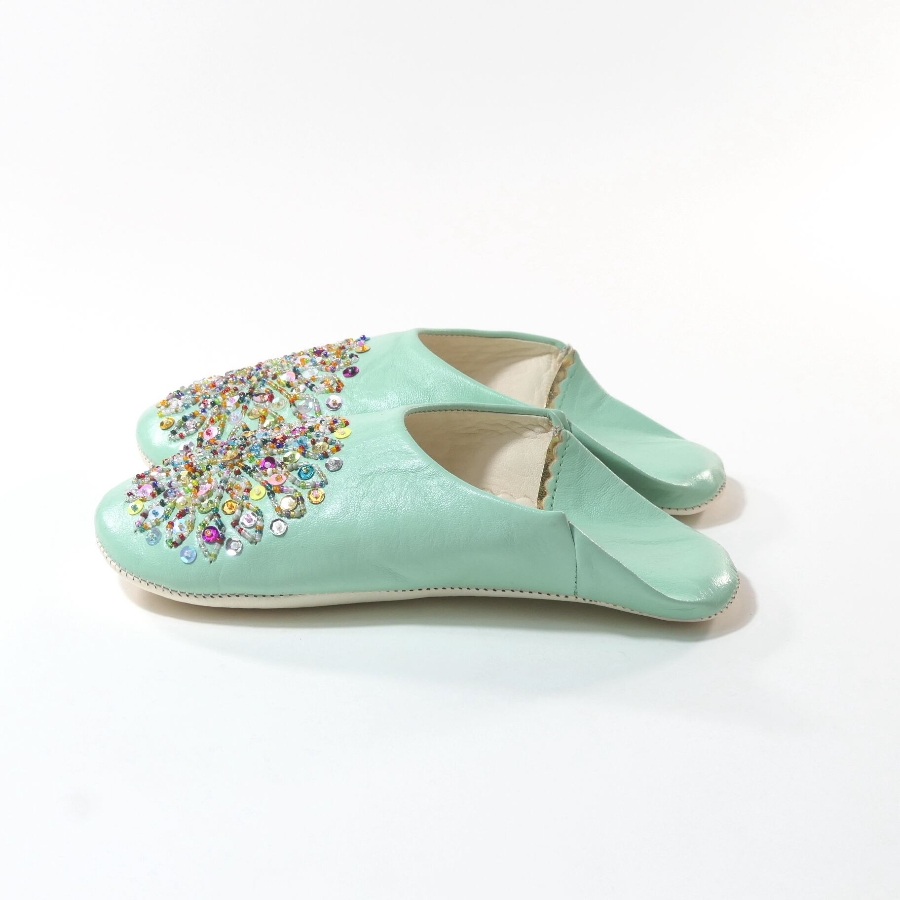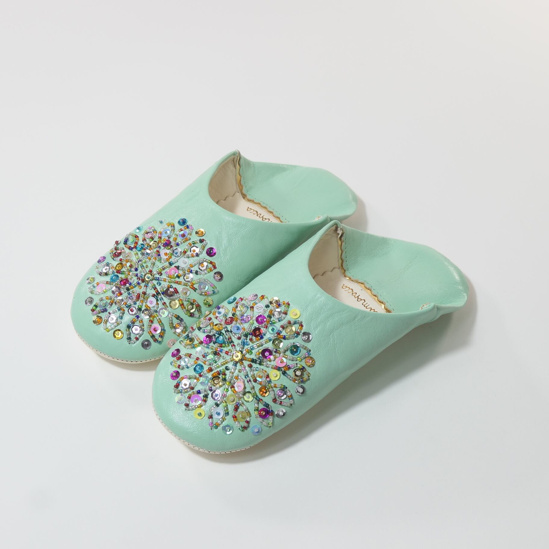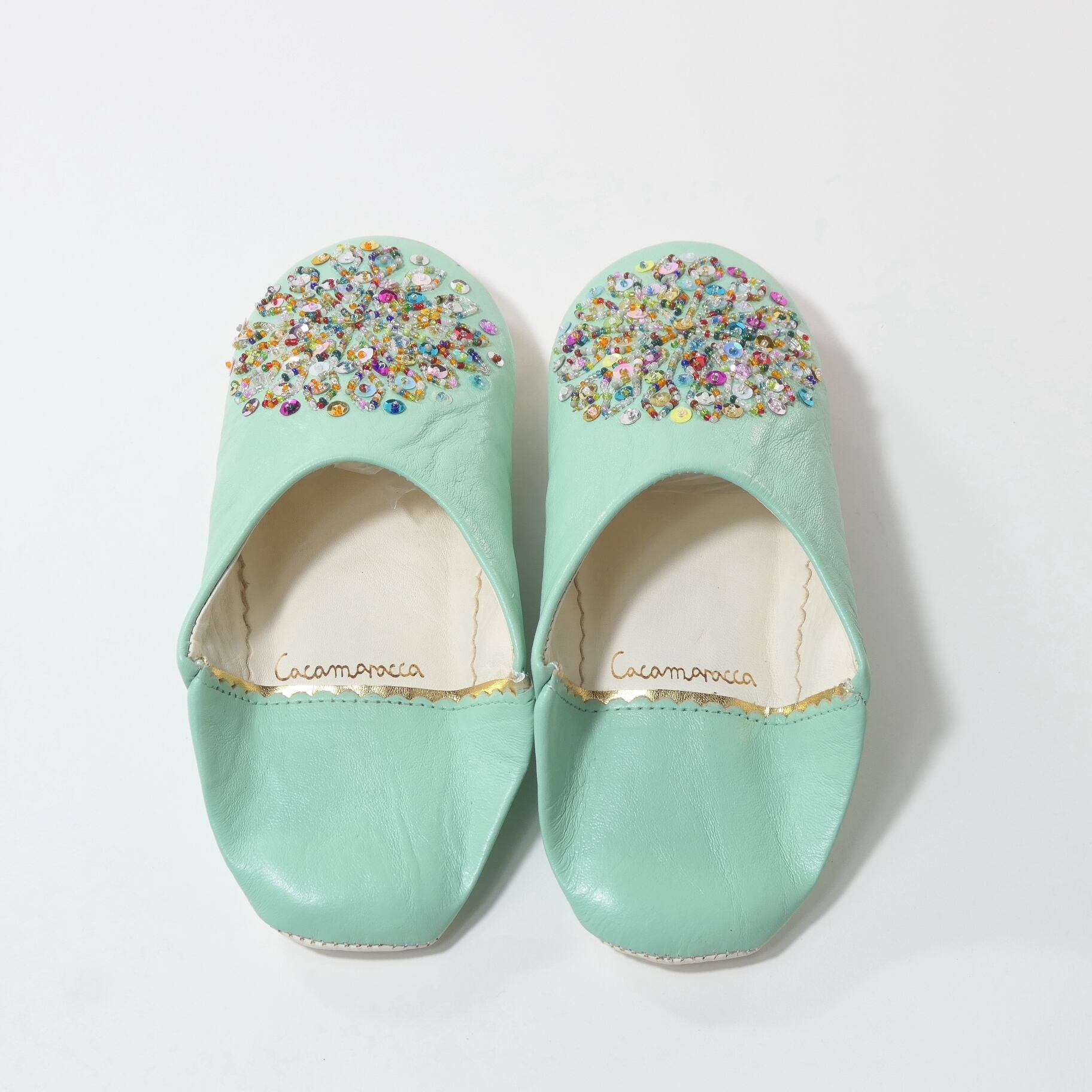 受注生産 スカイエメラルド(ミックス スパンコール)レザー バブーシュ スリッパ