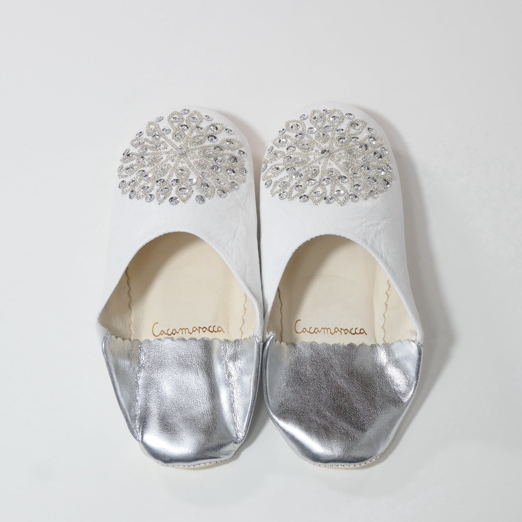 ホワイト&シルバー(シルバーレザー スパンコール)レザー バブーシュ スリッパ