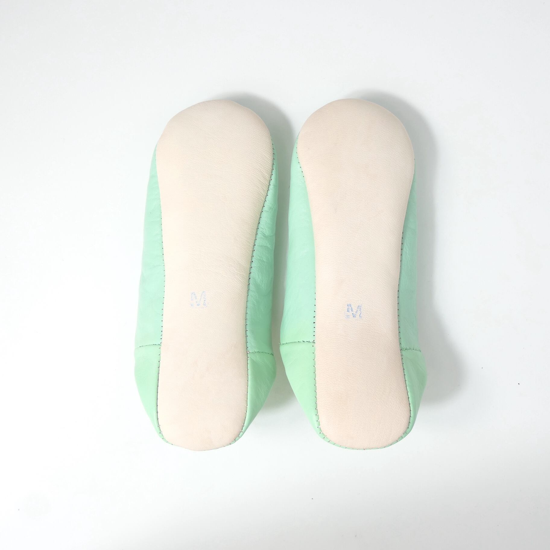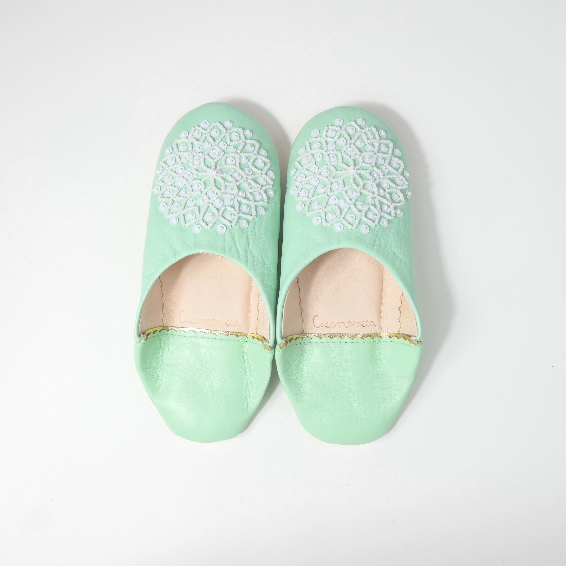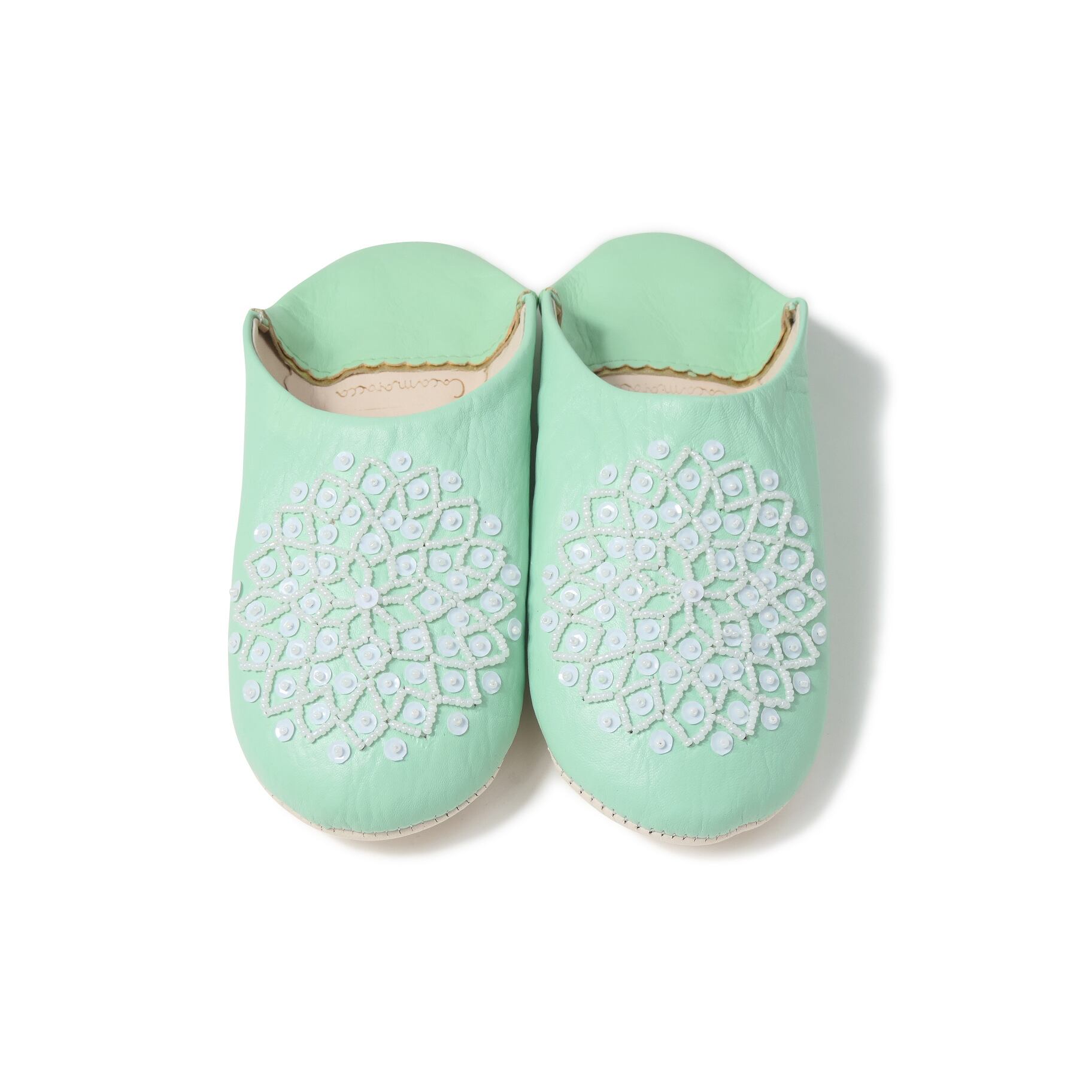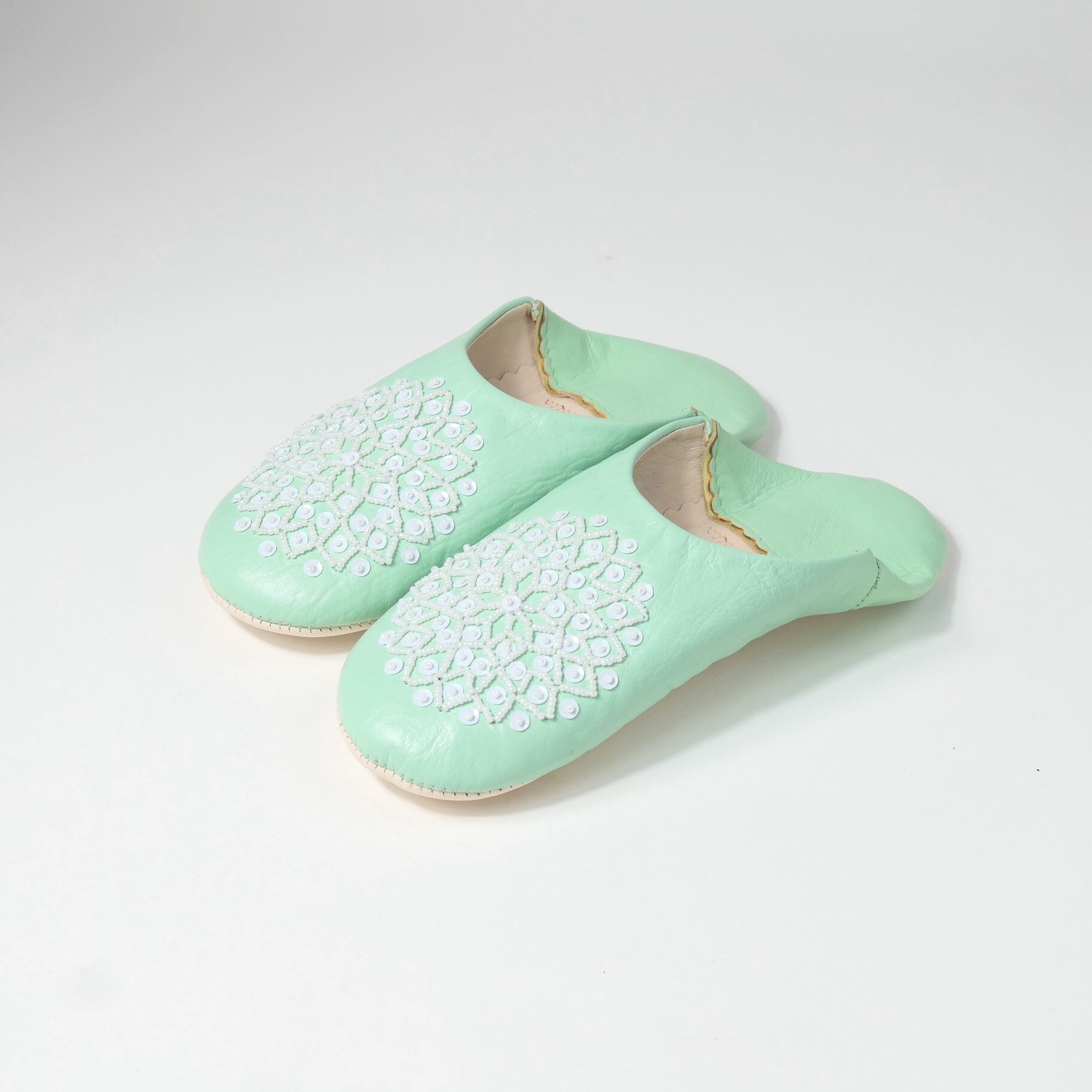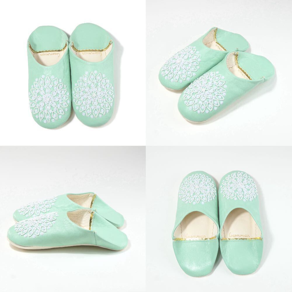 受注生産 スカイエメラルド(ホワイト スパンコール) レザー バブーシュ スリッパ