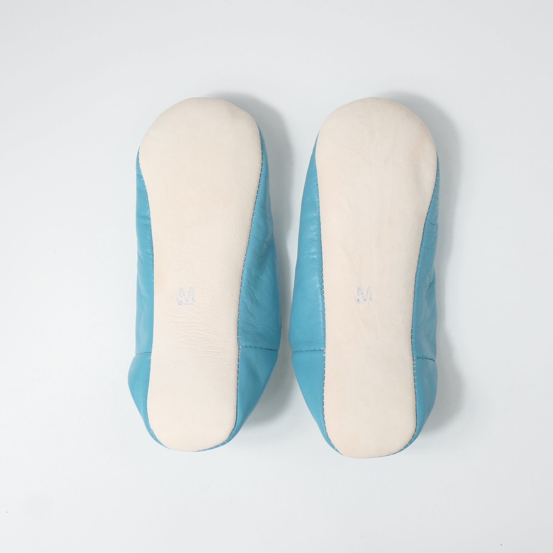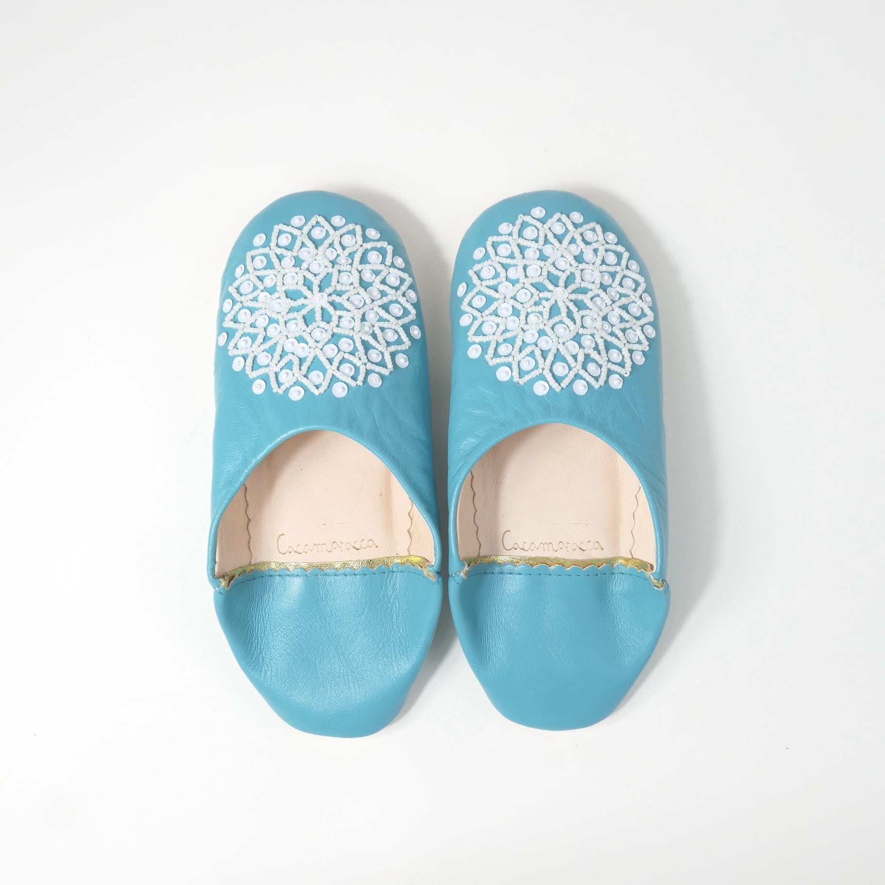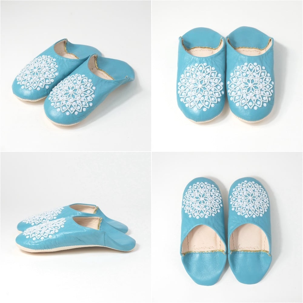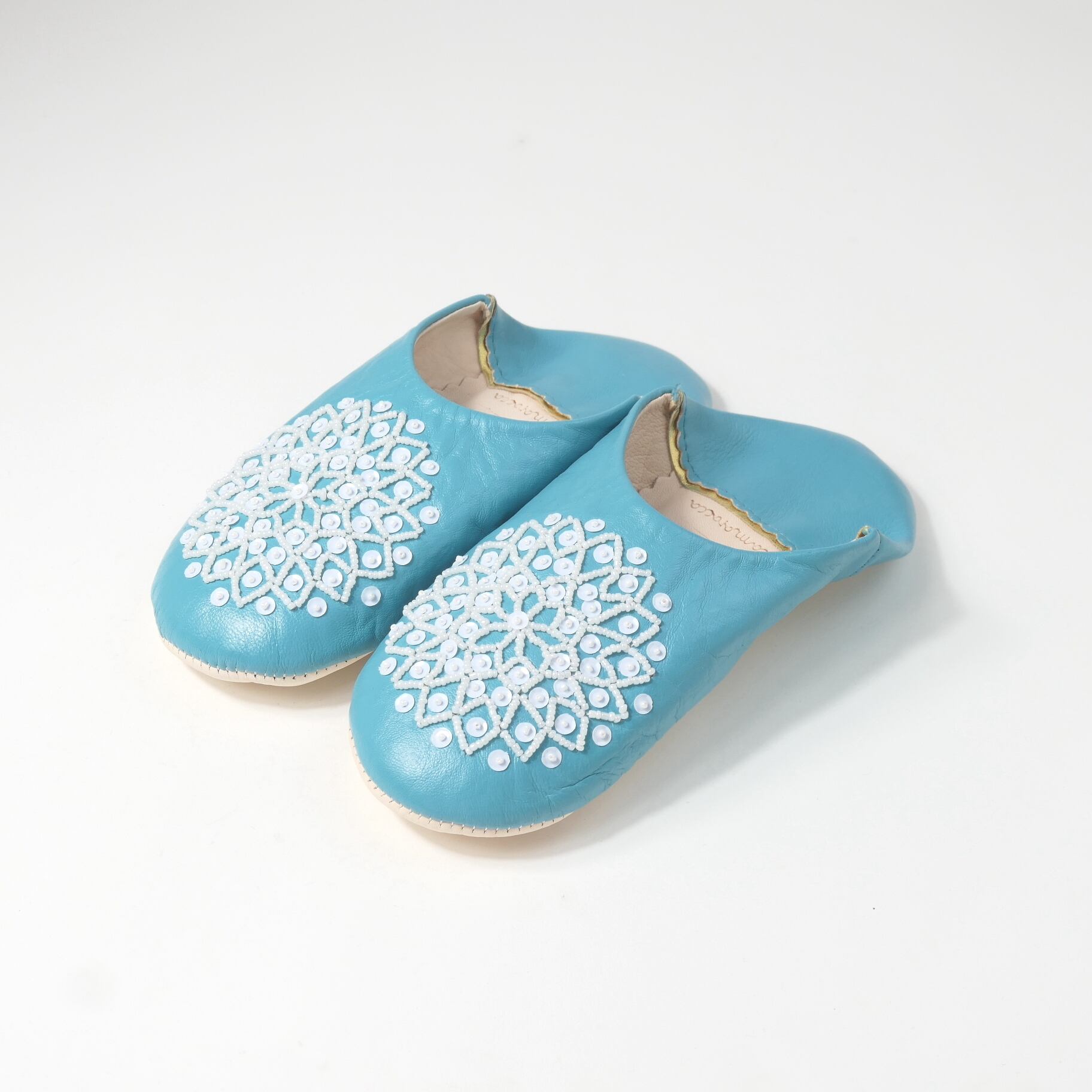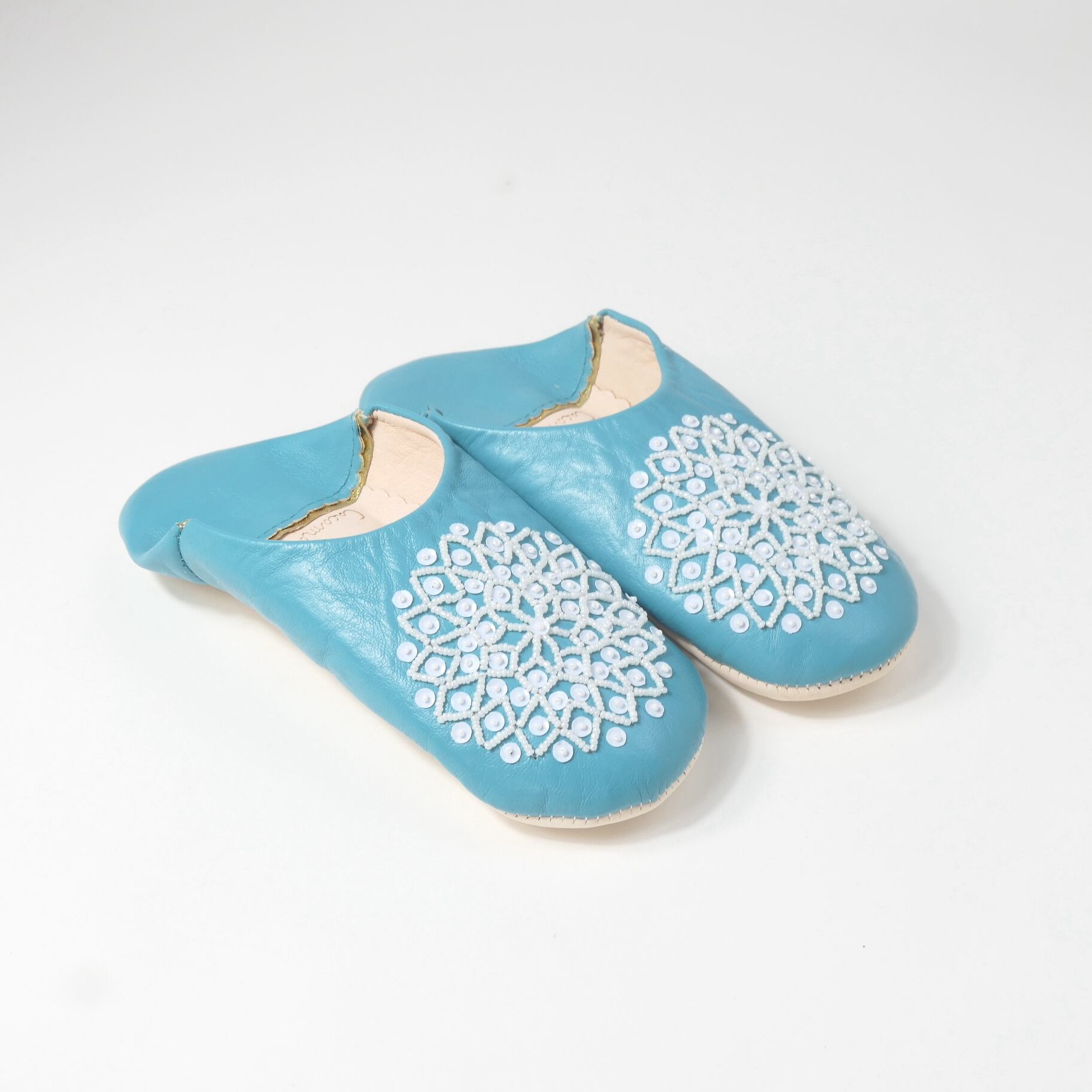受注生産 ブルー(ホワイト スパンコール) レザー バブーシュ スリッパ