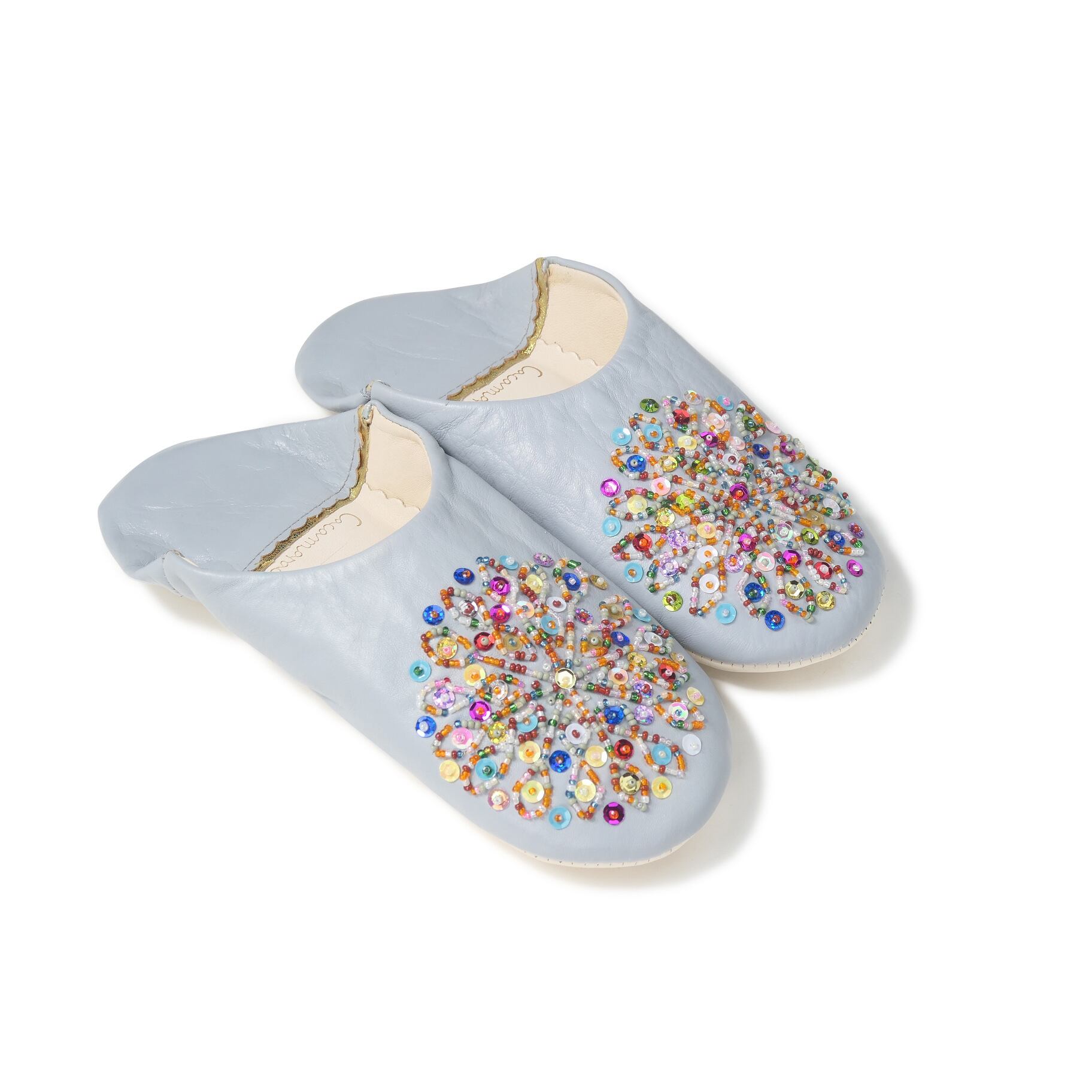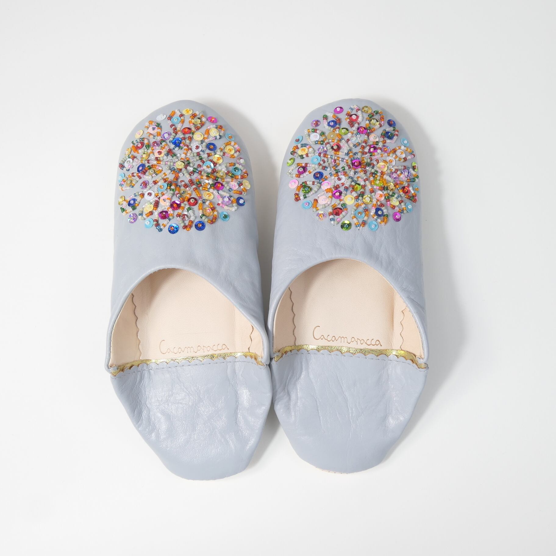 受注生産 ソフトグレー(ミックス スパンコール)レザー バブーシュ スリッパ