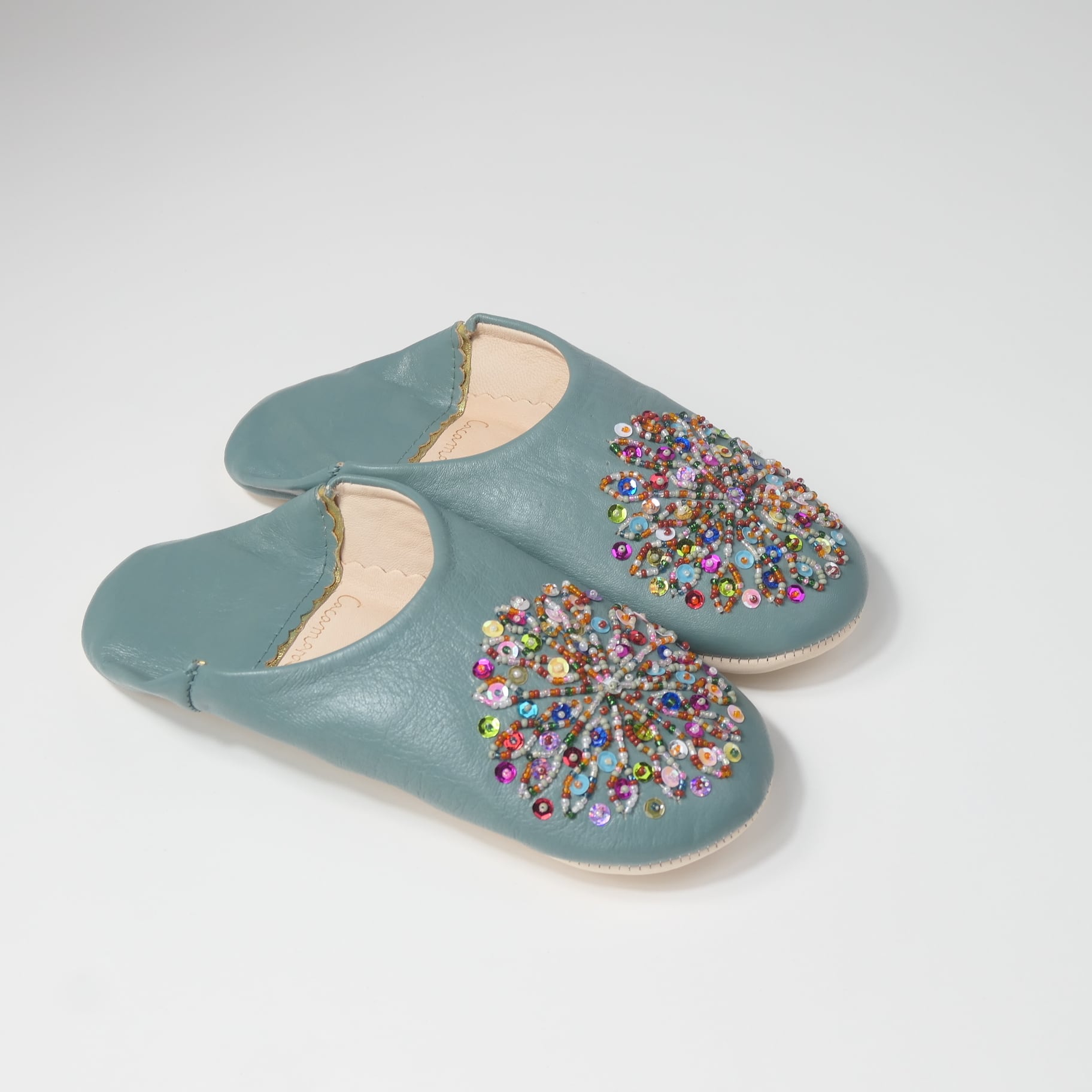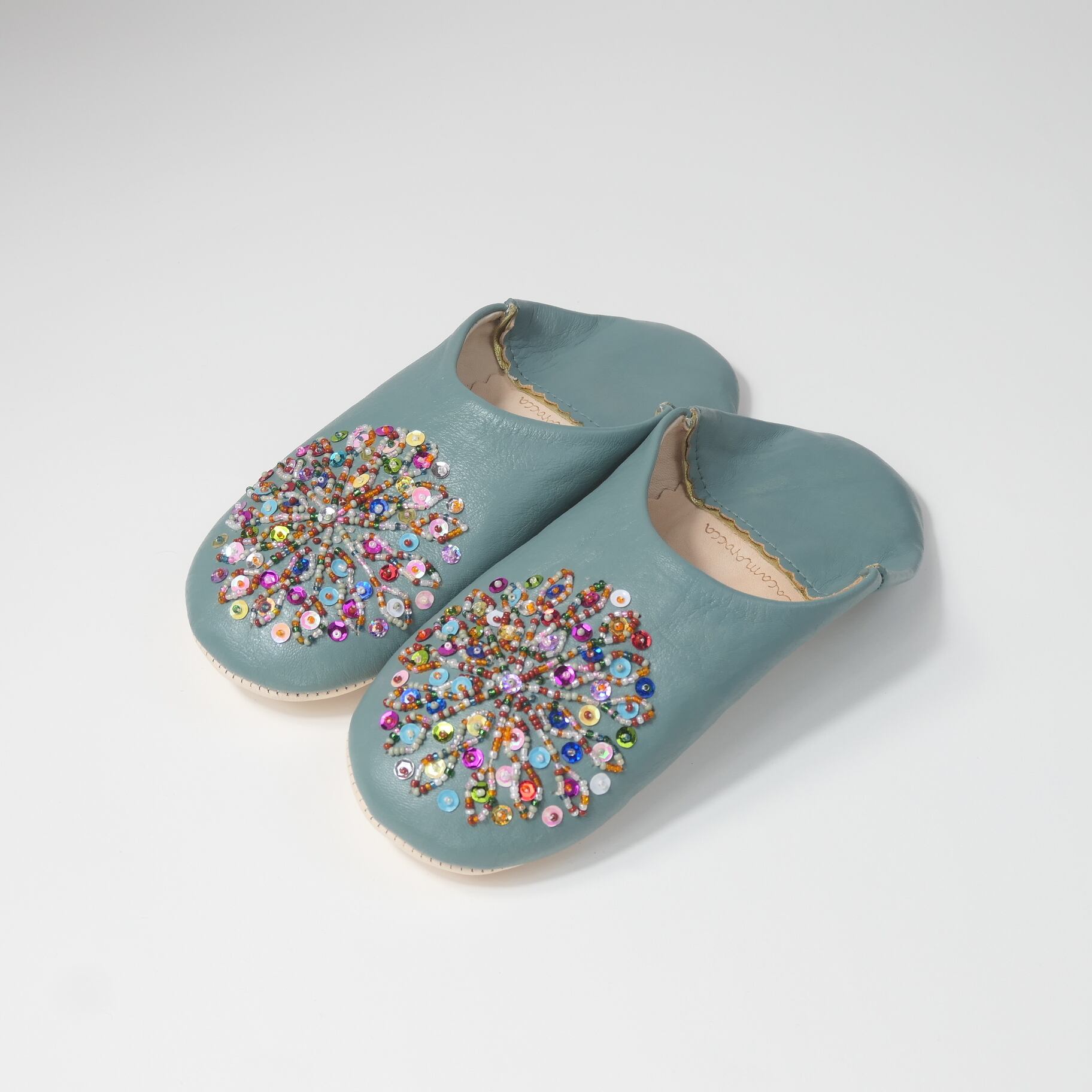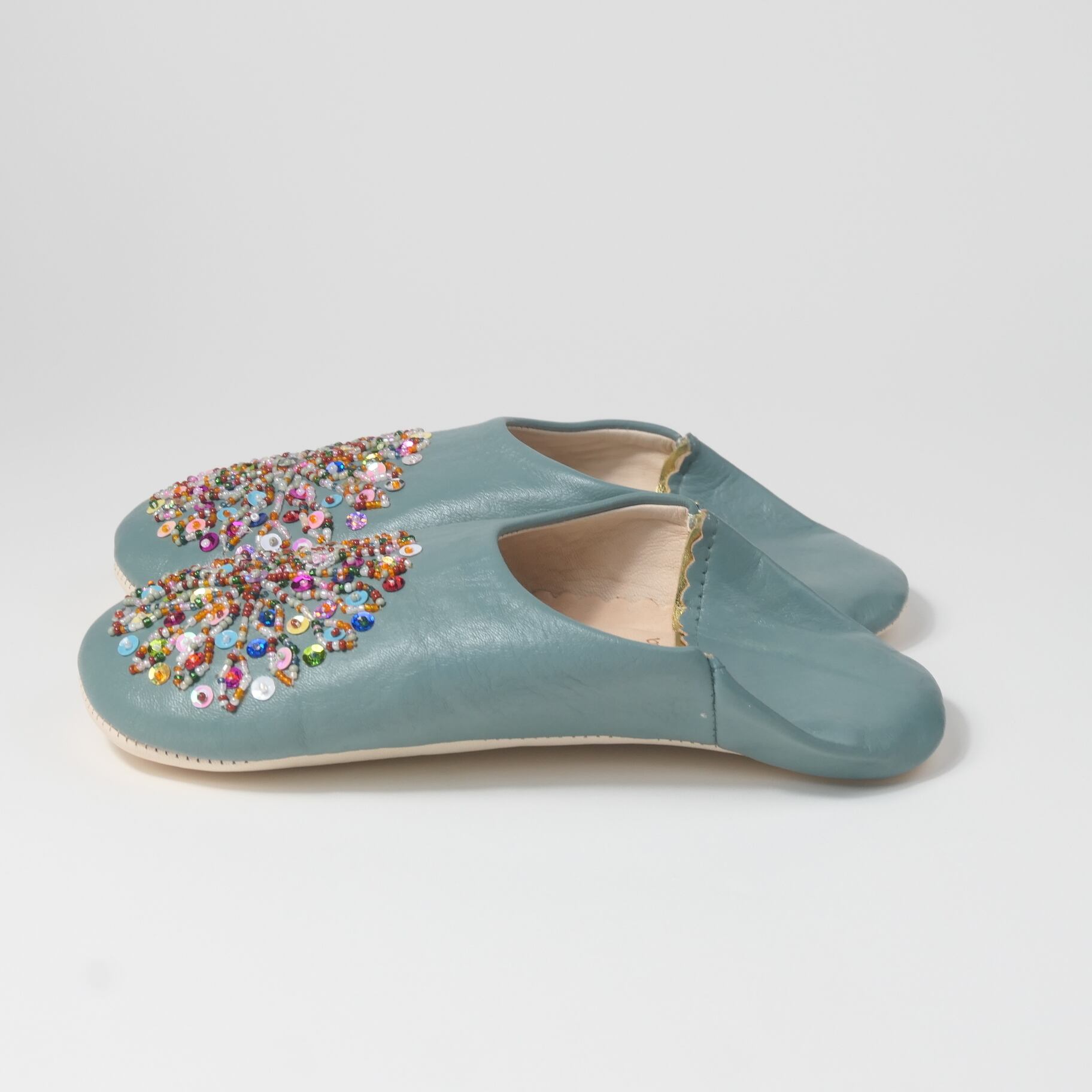 受注生産 アクアグリーン(ミックス スパンコール)レザー バブーシュ スリッパ