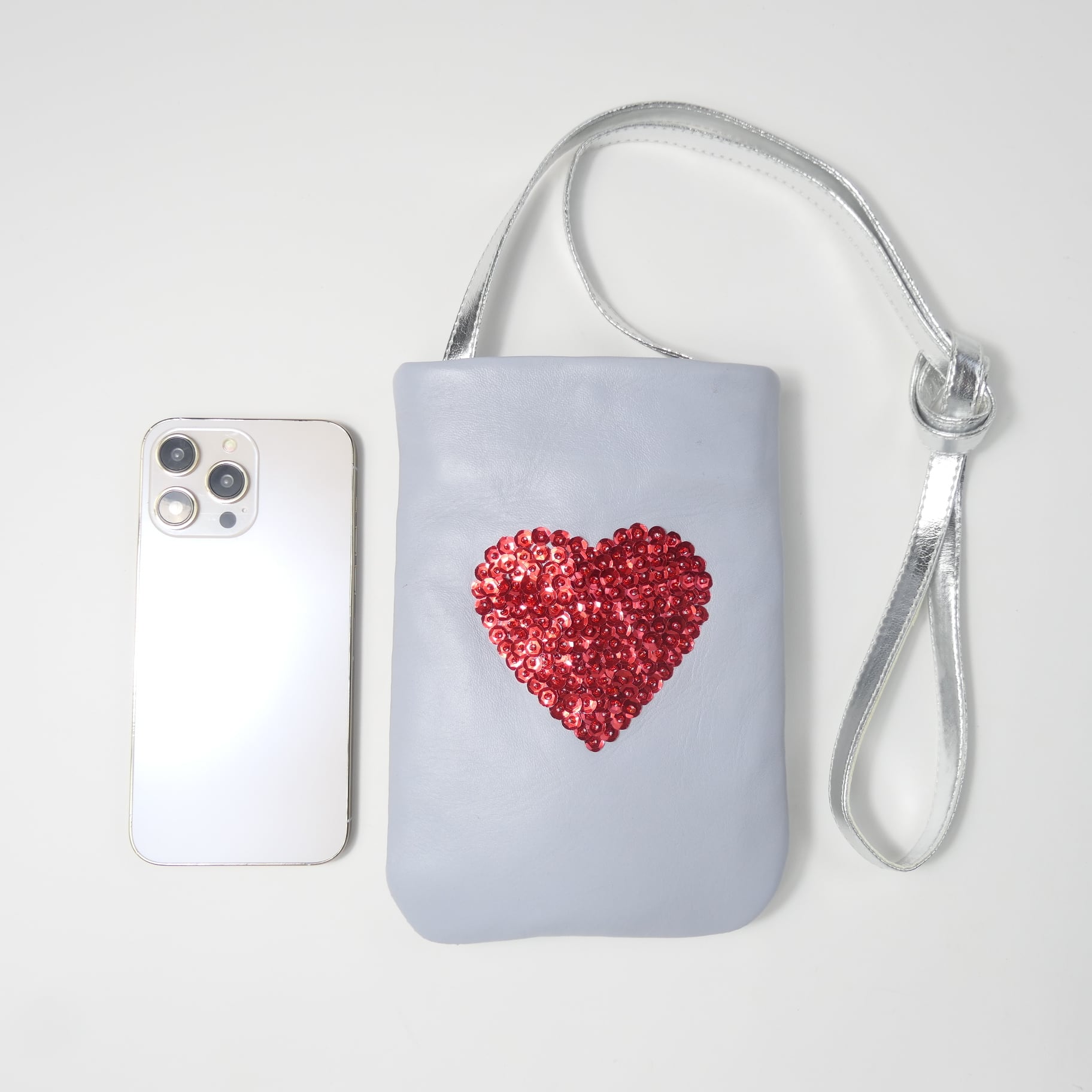 ソフトグレー(ハート) レザー スマホ ショルダーバッグ Mサイズ(スパンコール刺しゅう)モロッコ ポーチ