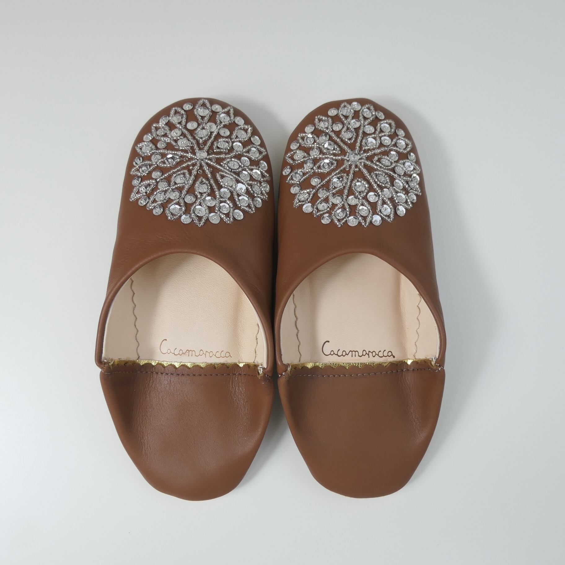 ブラウン(シルバースパンコール)レザー バブーシュ スリッパ