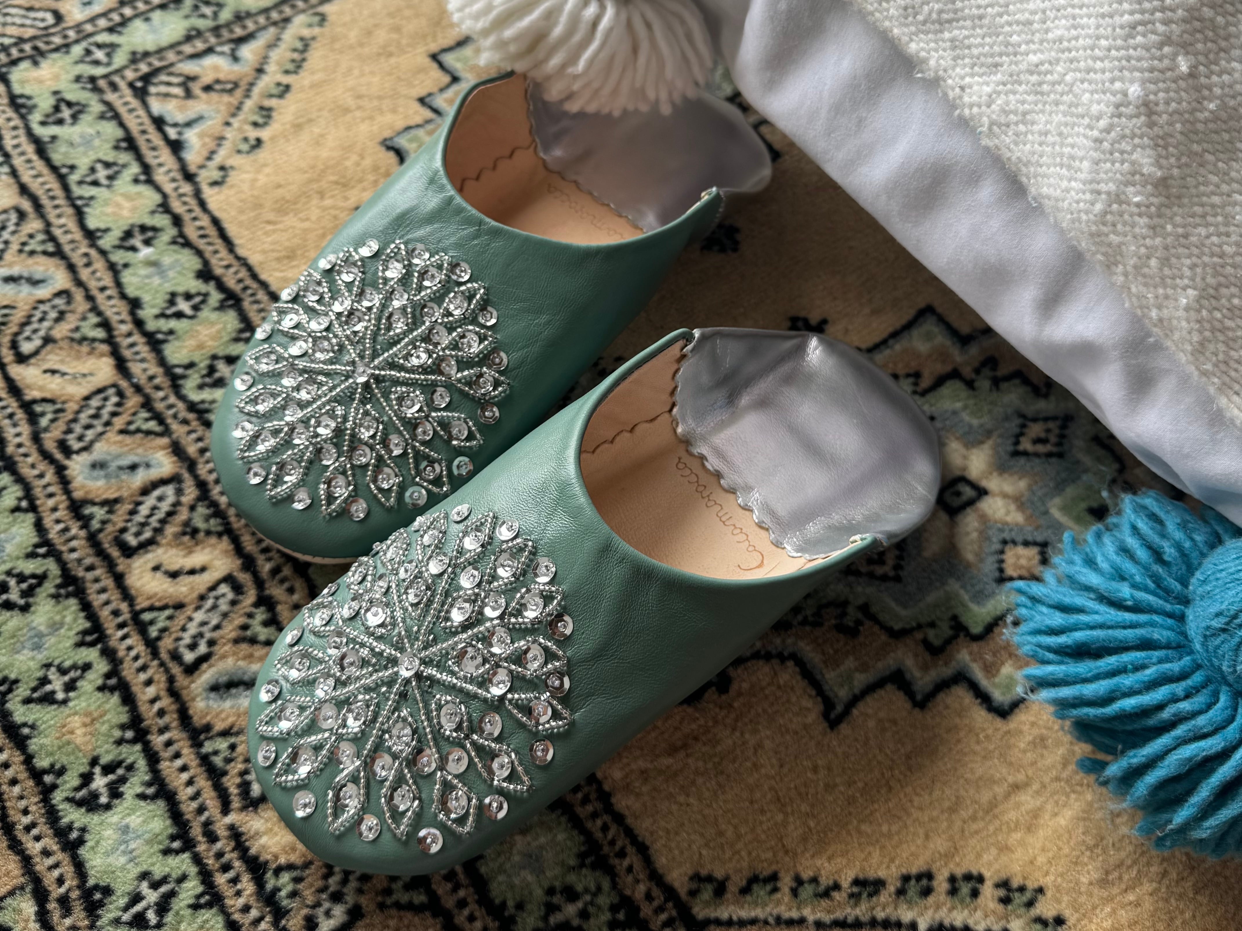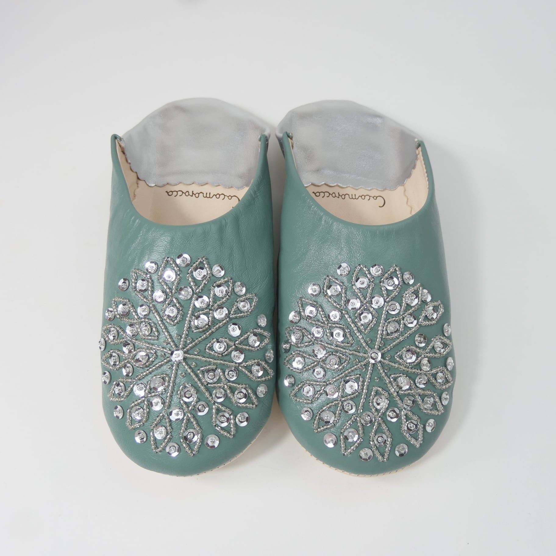 アクアグリーン&シルバー(シルバーレザー スパンコール)レザー バブーシュ スリッパ